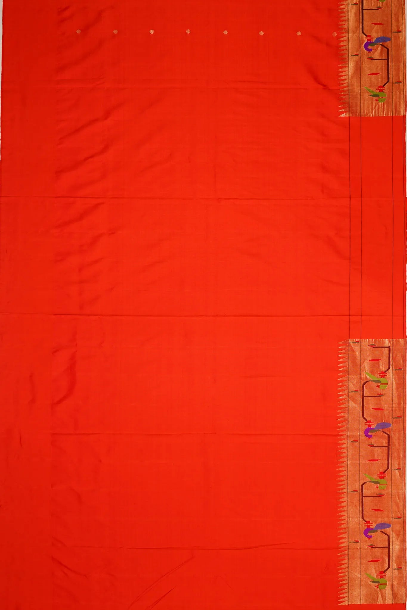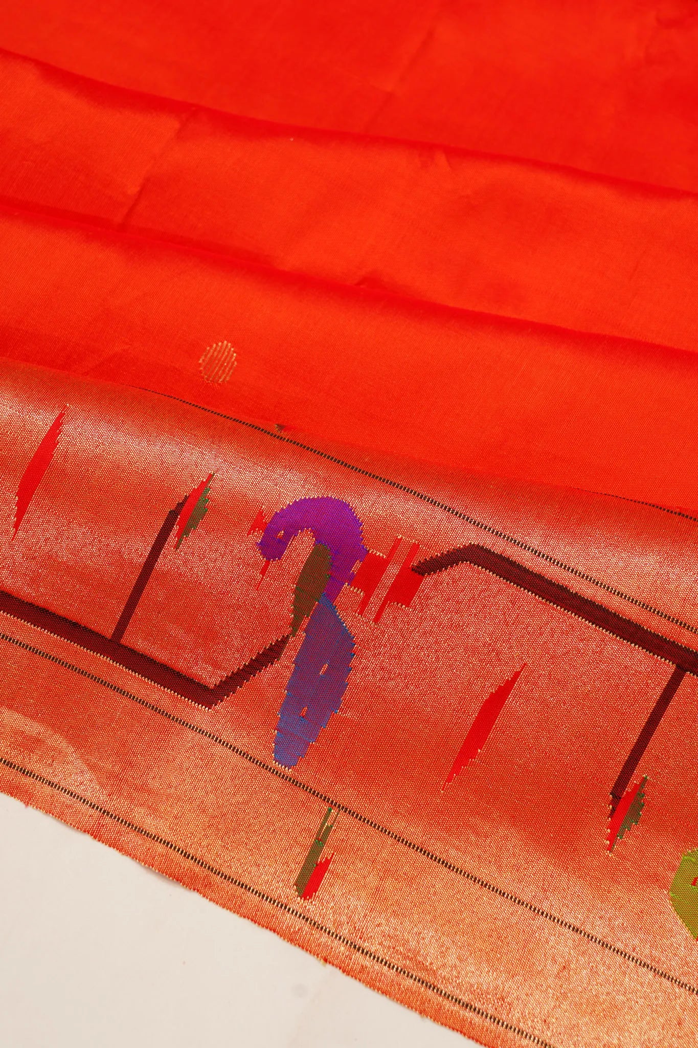 The saree's akruthi border presents a striking contrast, embellished with gold zari tissue featuring intricate peacock and parrot motifs set against a floral backdrop