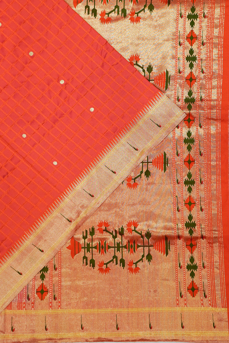 Paithani Silk Checks And Butta Orange Saree With Single Muniya Border