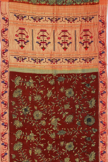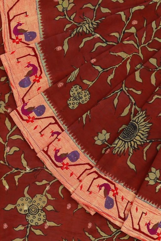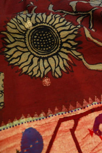 Paithani Silk Hand Painted Maroon Saree With Attached Kalamkari on Paithani border