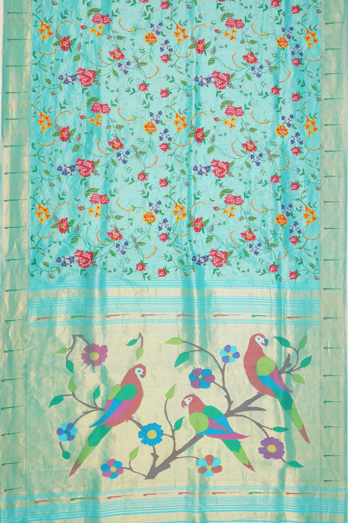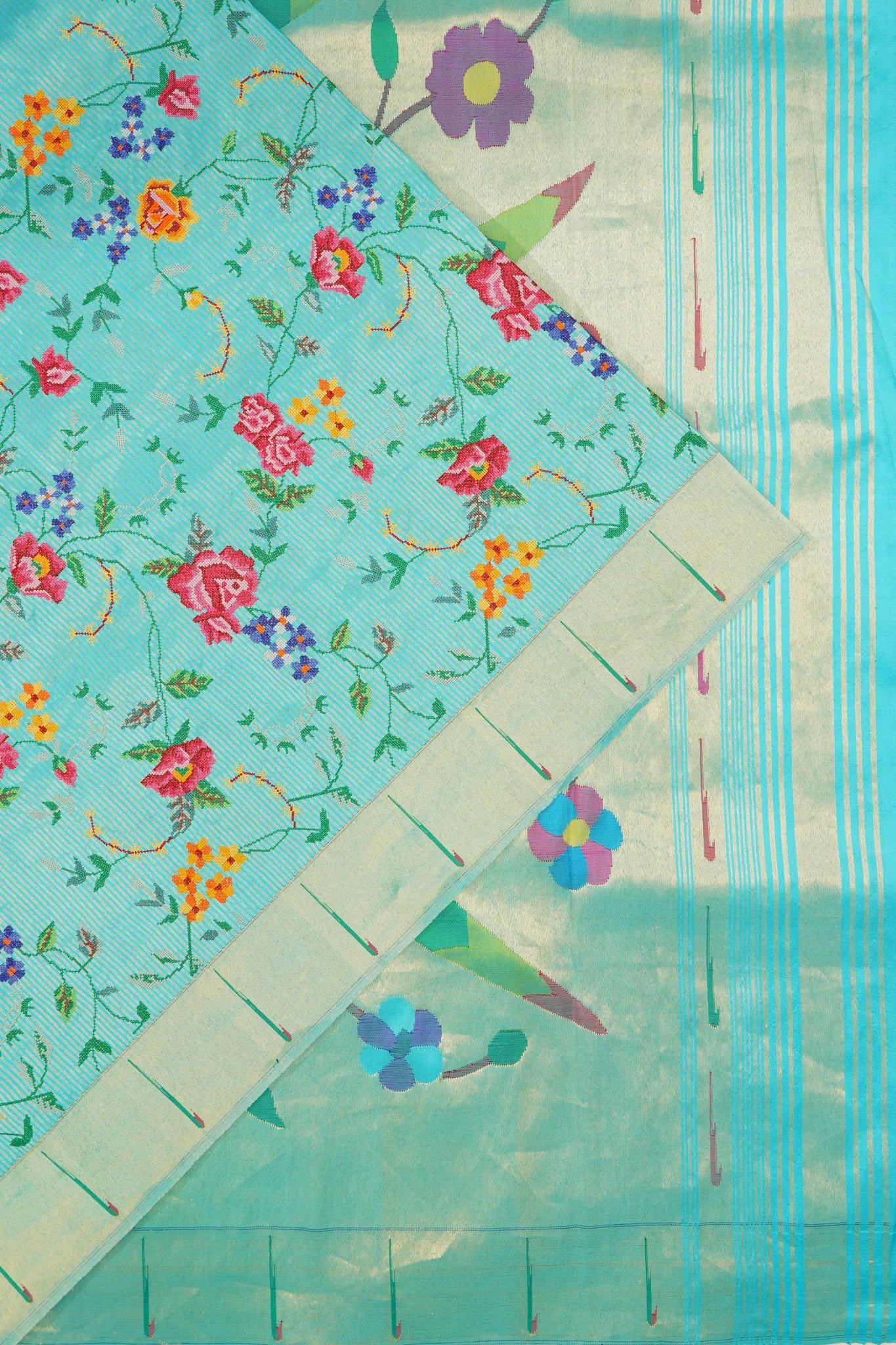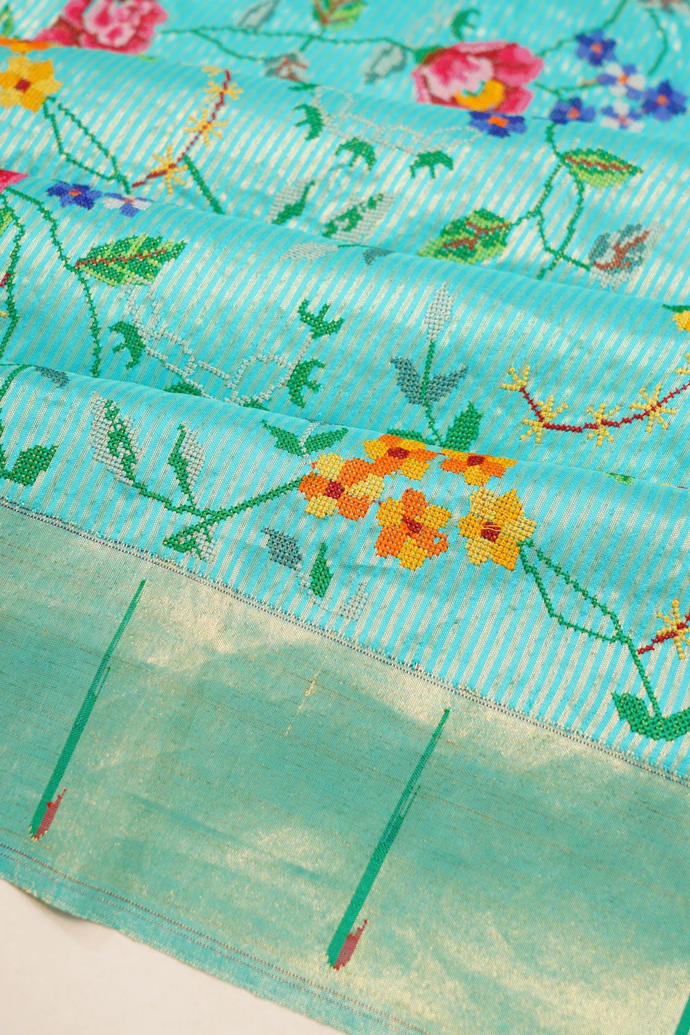 Paithani Silk Vertical Lines And Embroidery Sky Blue Saree With Single Muniya Border