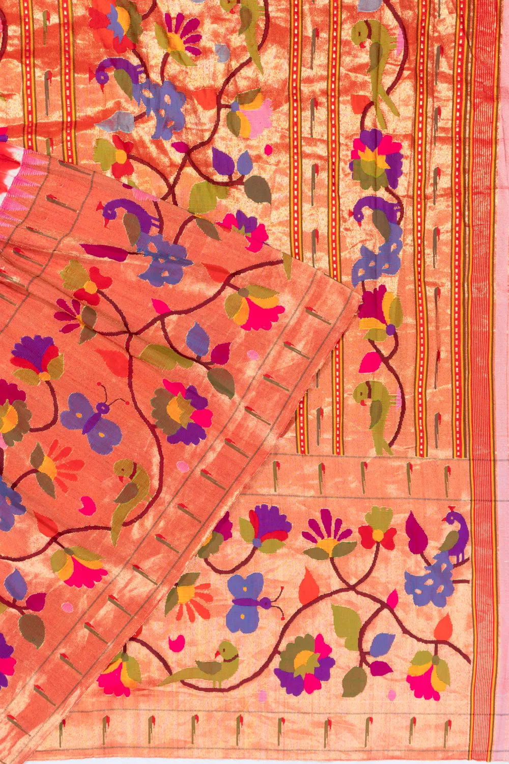 The contrast gold zari tissue big border showcases parrot motifs in florals, further accentuated by muniyas that add a traditional Paithani touch.