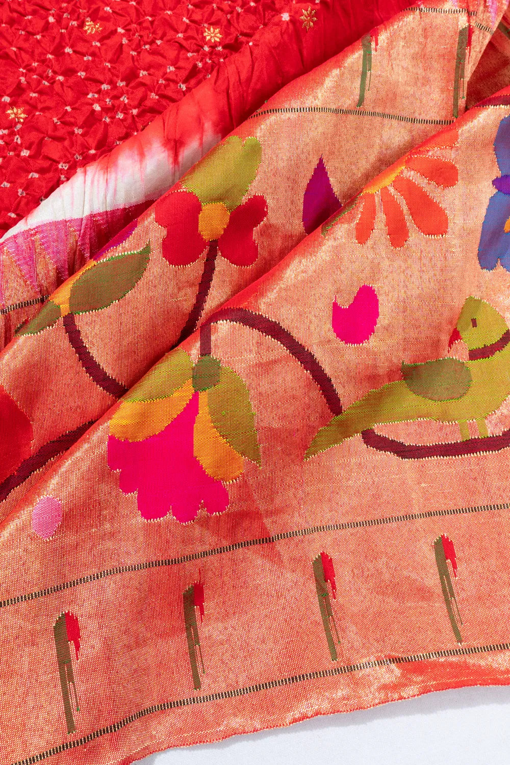 Paithani X Bandhani Silk Butta Red Saree With Big Border