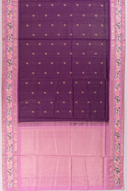 The purple base is woven with gold zari checks and adorned with elegant peacock motif buttis, creating a regal canvas enriched with traditional artistry.