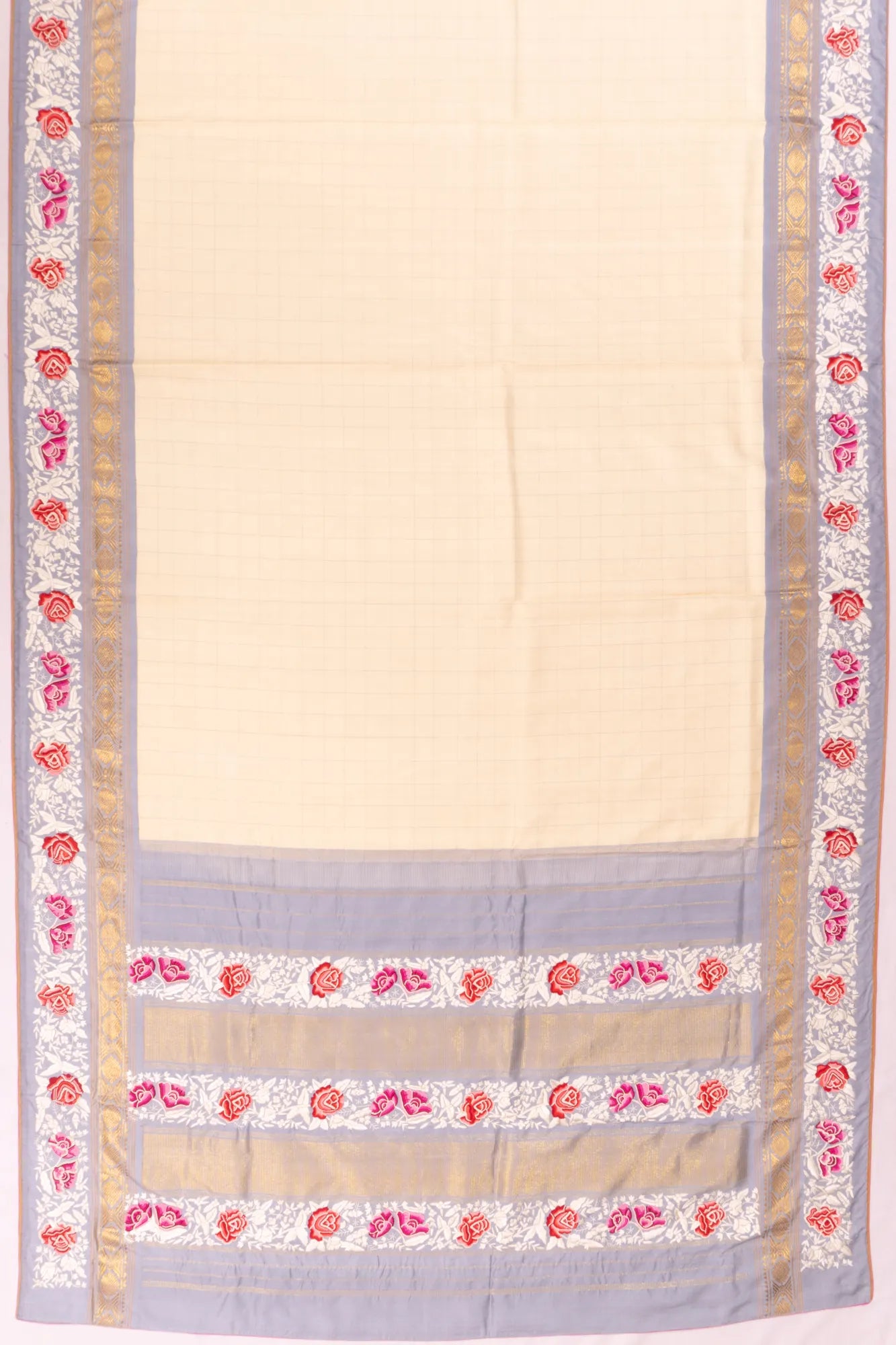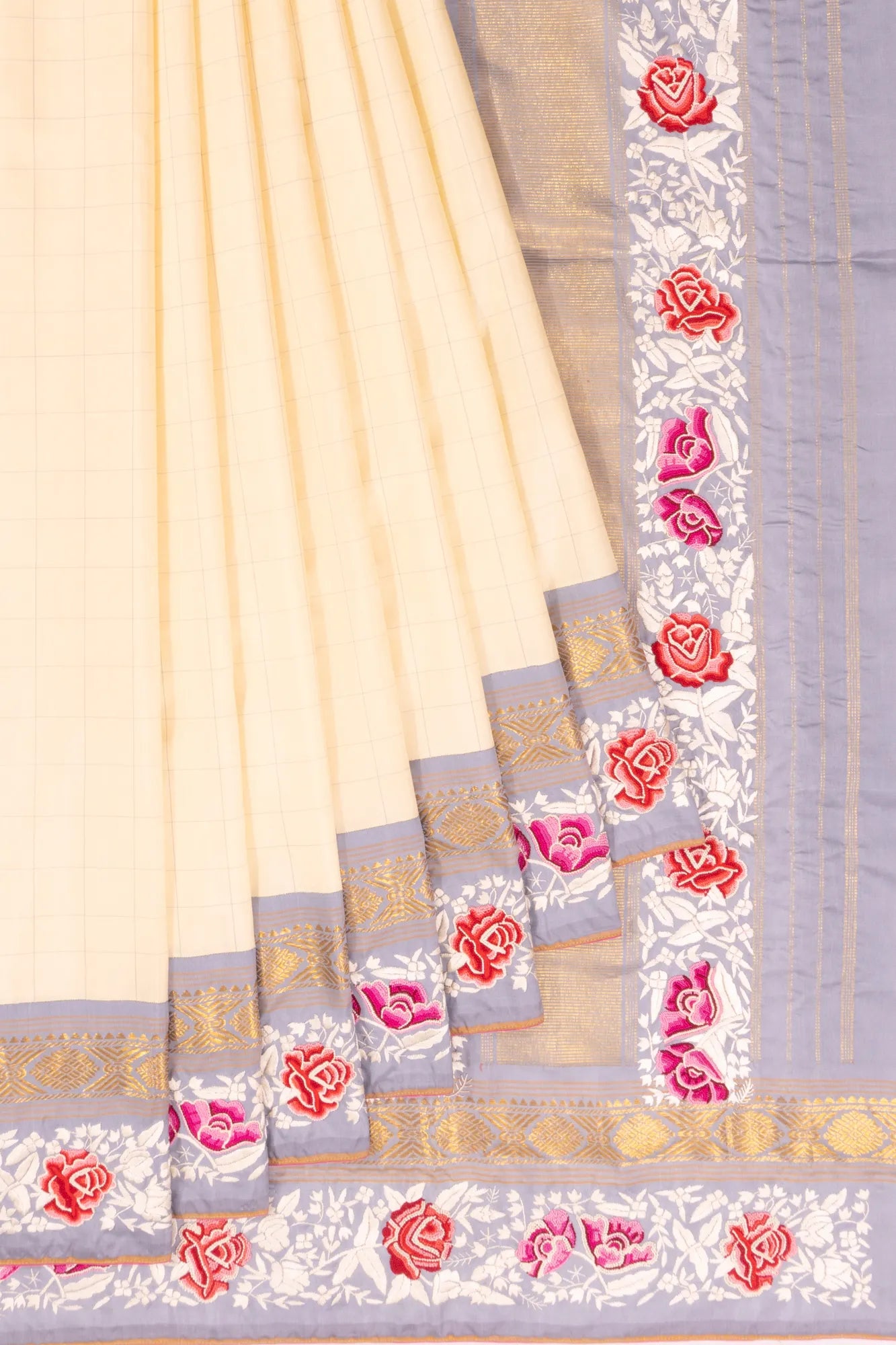 Parsi Gara X Kanchipuram Silk Checks Cream Saree With French Knot Embroidery