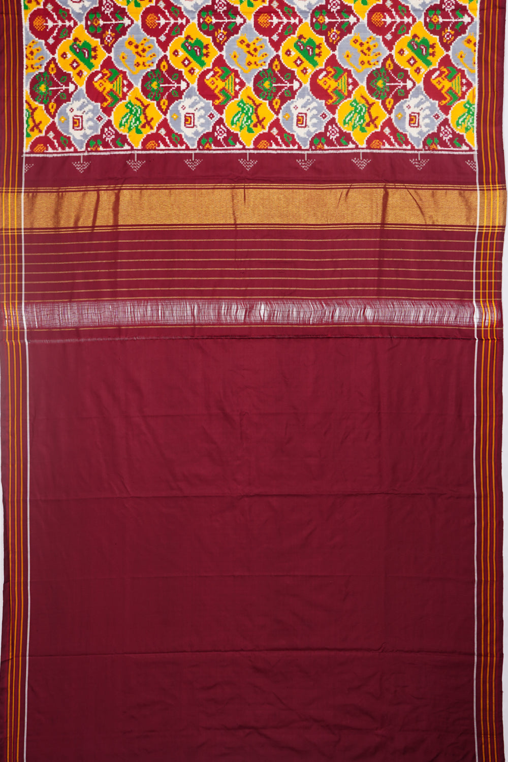 Handwoven sarees carefully handpicked, since 1943. Introducing the Patan Patola Silk Double Ikat 8 Figure Grey And Maroon Saree This exquisite saree features a small self zari border and a double ikat body pattern, perfect for a wedding occasion Kankatala is dedicated to quality and India's weaving heritage, working closely with skilled craftsmen to bring designs to life With an 80-year legacy of handpicking the finest drapes, Kankatala offers exclusive weaves, including Patan Patolas