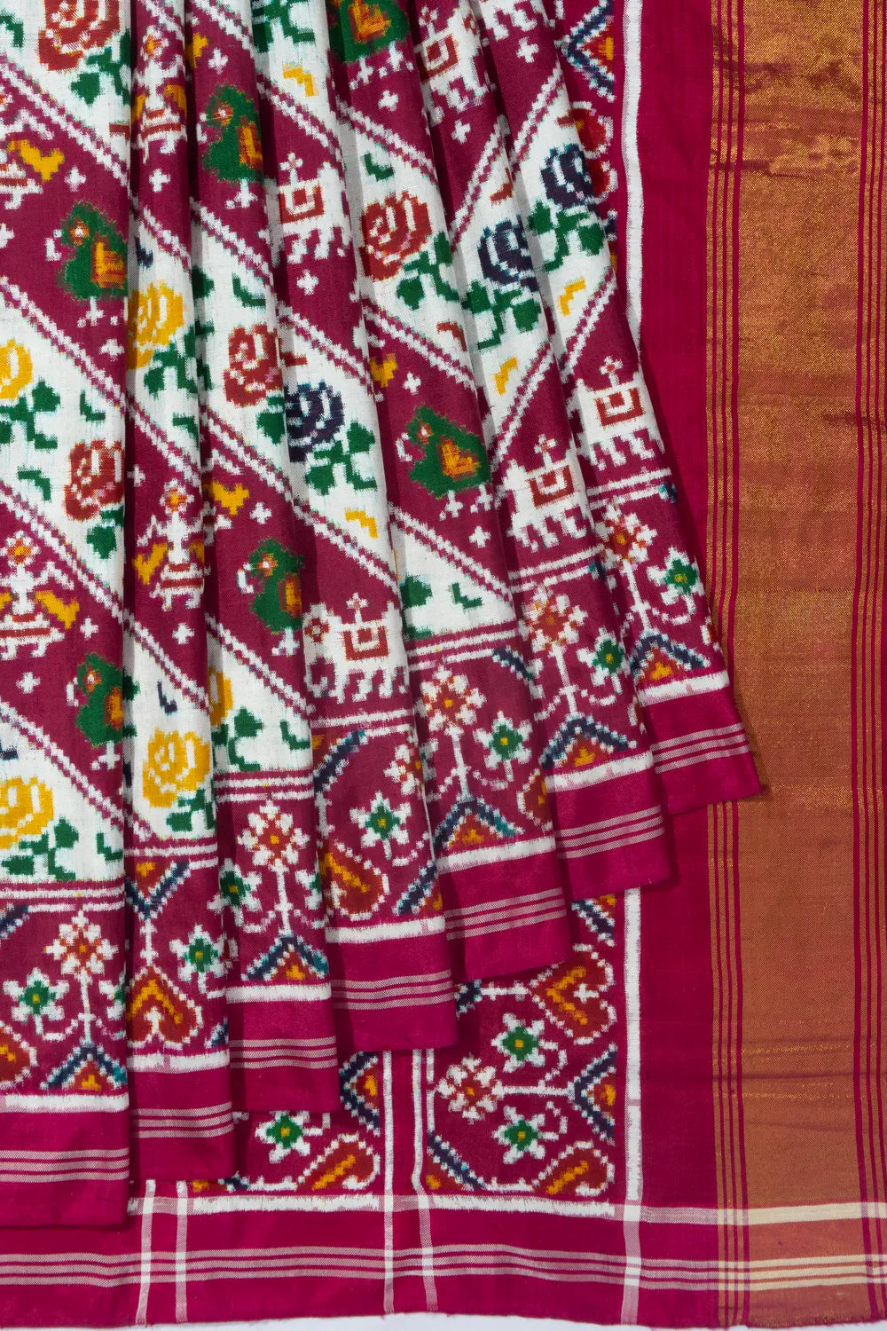 Patan Patola is a centuries-old double ikat weave from Gujarat, known for its perfect symmetry and vibrant motifs.