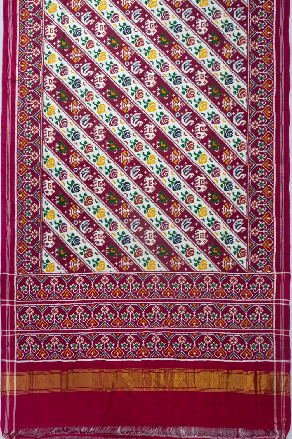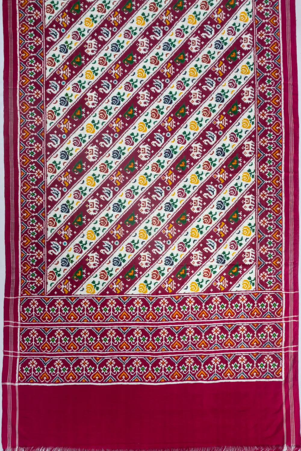 Woven entirely by hand, the process takes 4 to 6 months and involves resist-dyeing both warp and weft threads before they’re woven — a technique mastered by just a few skilled families in Patan