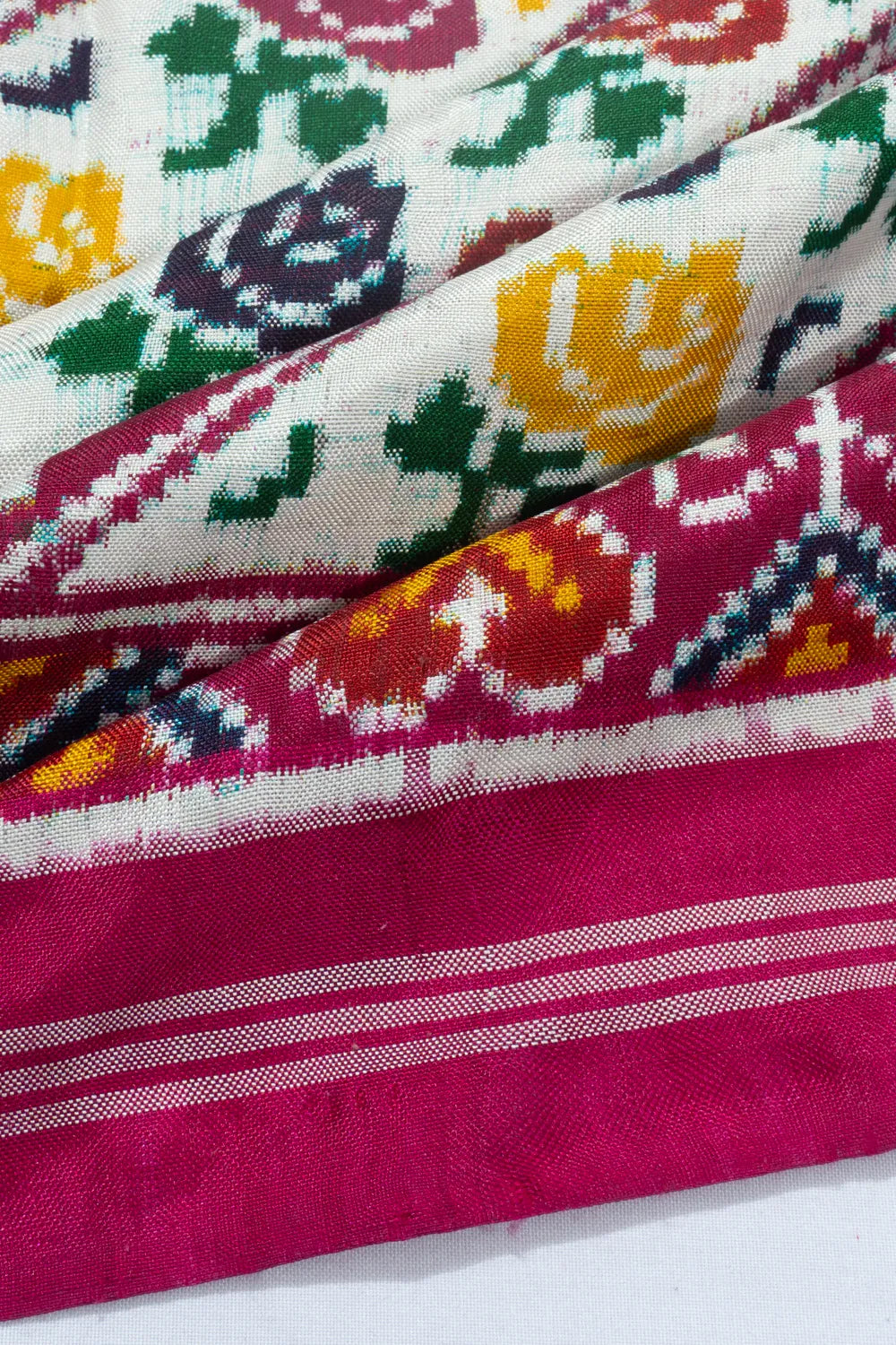 A delicate white base woven with soft floral Ikat motifs, exuding elegance with every drape.