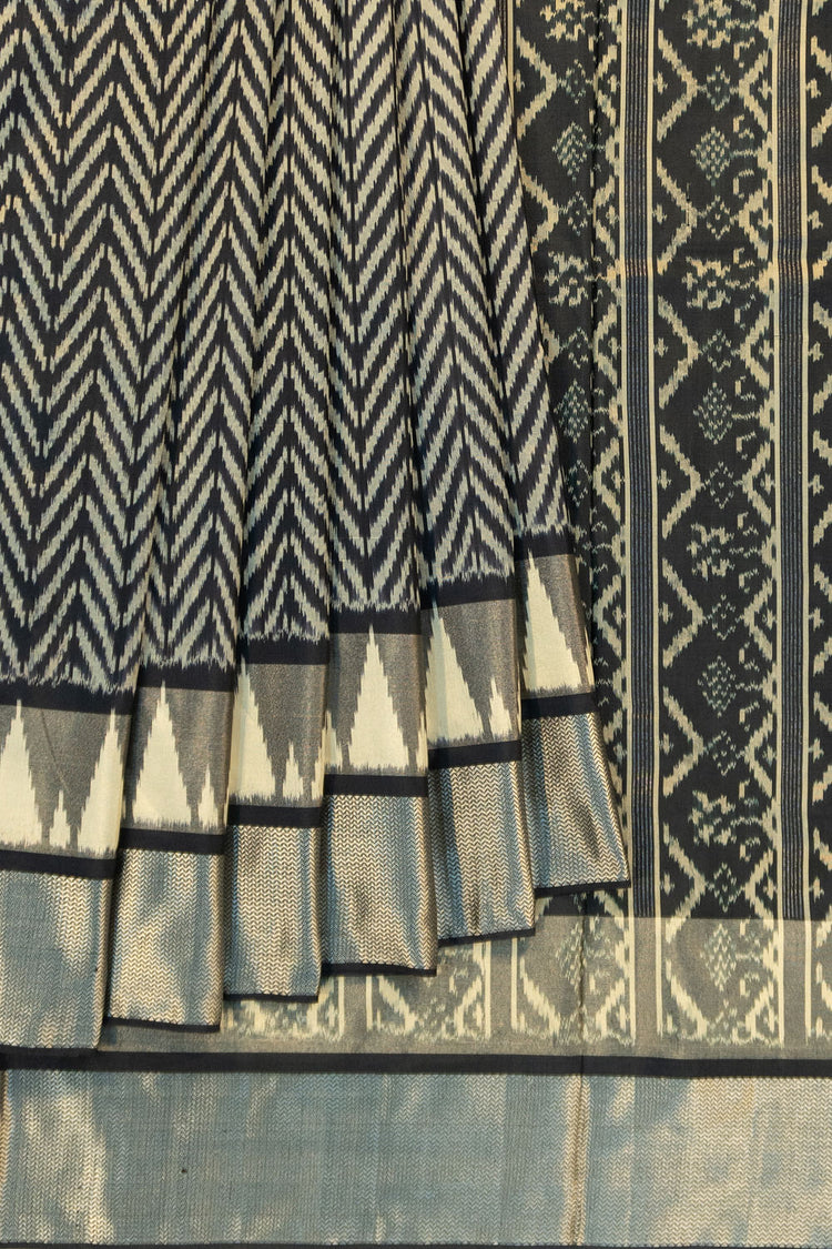 Features a self silver zari medium border with zig-zag lines, adding a contemporary touch to the classic ikat design.