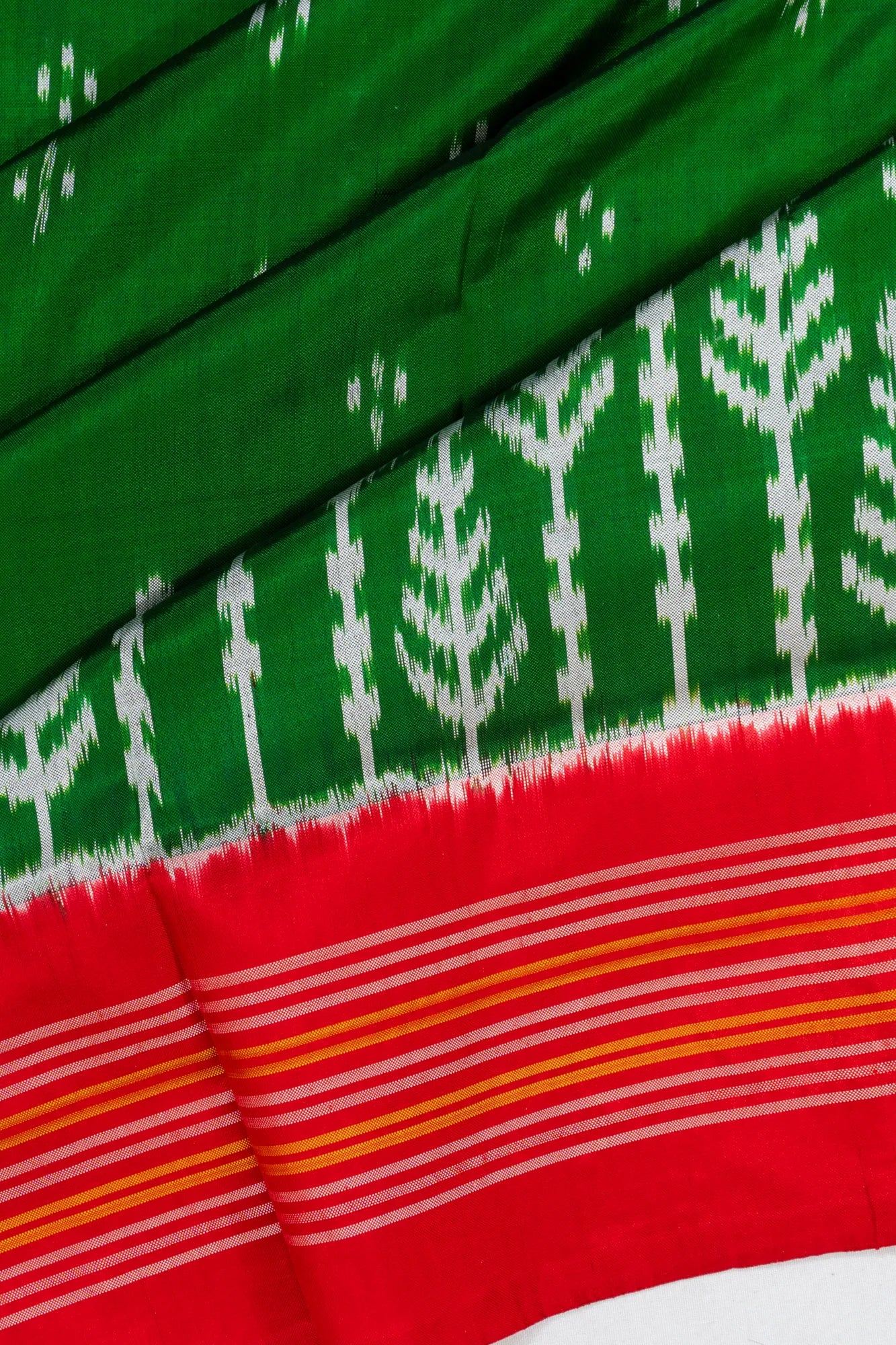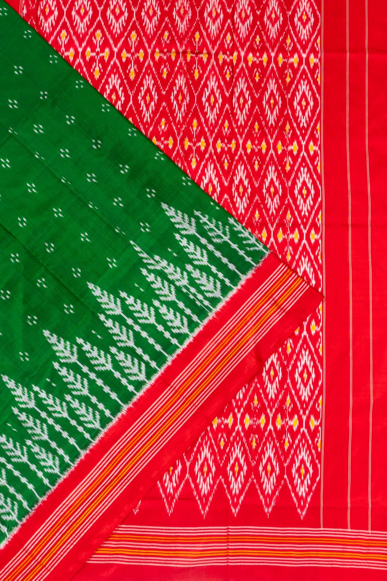 Dark green base adorned with scattered floral Ikat buttas and a rich floral Ikat brocade design on the pleats, adding depth and elegance.