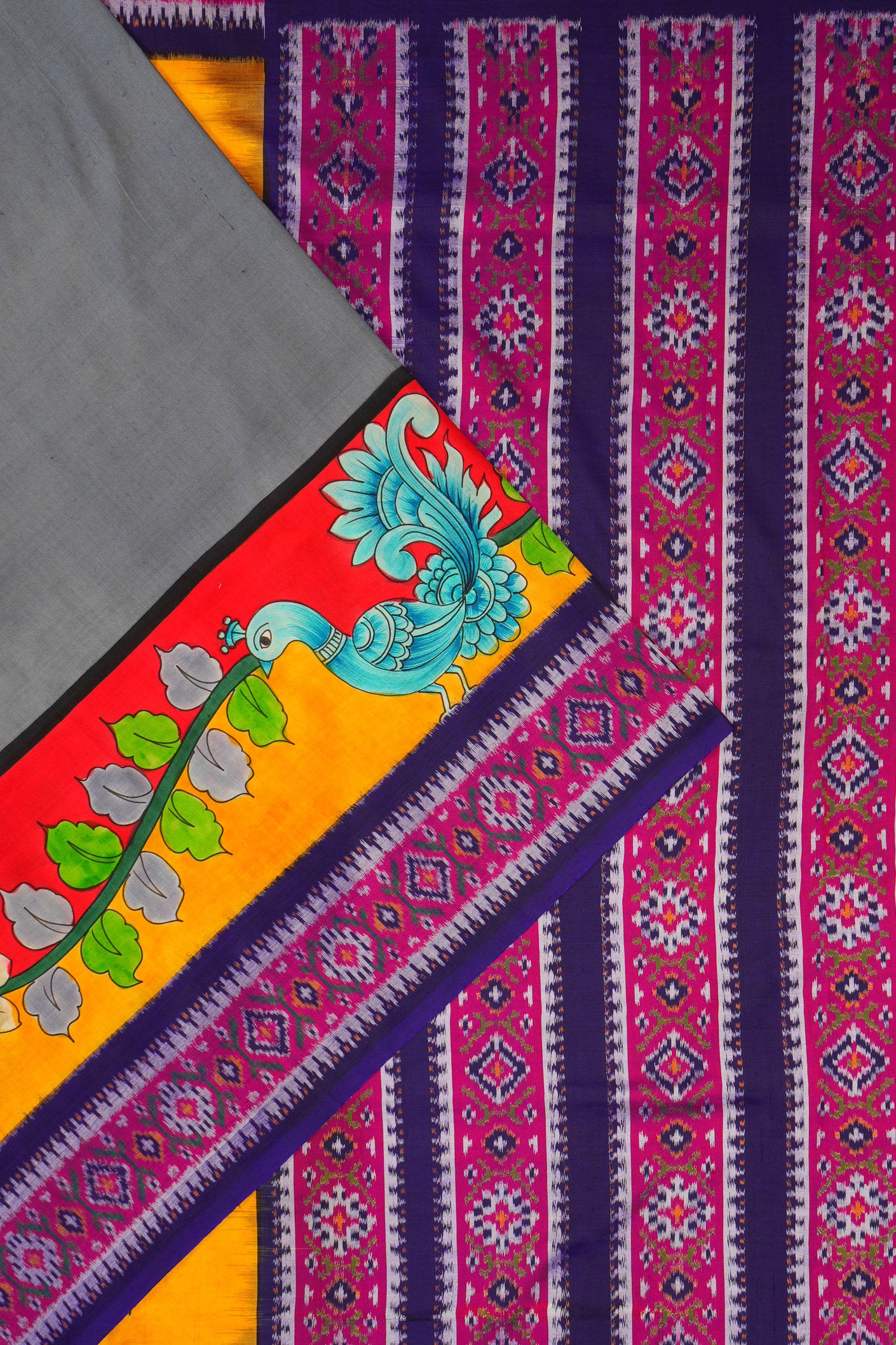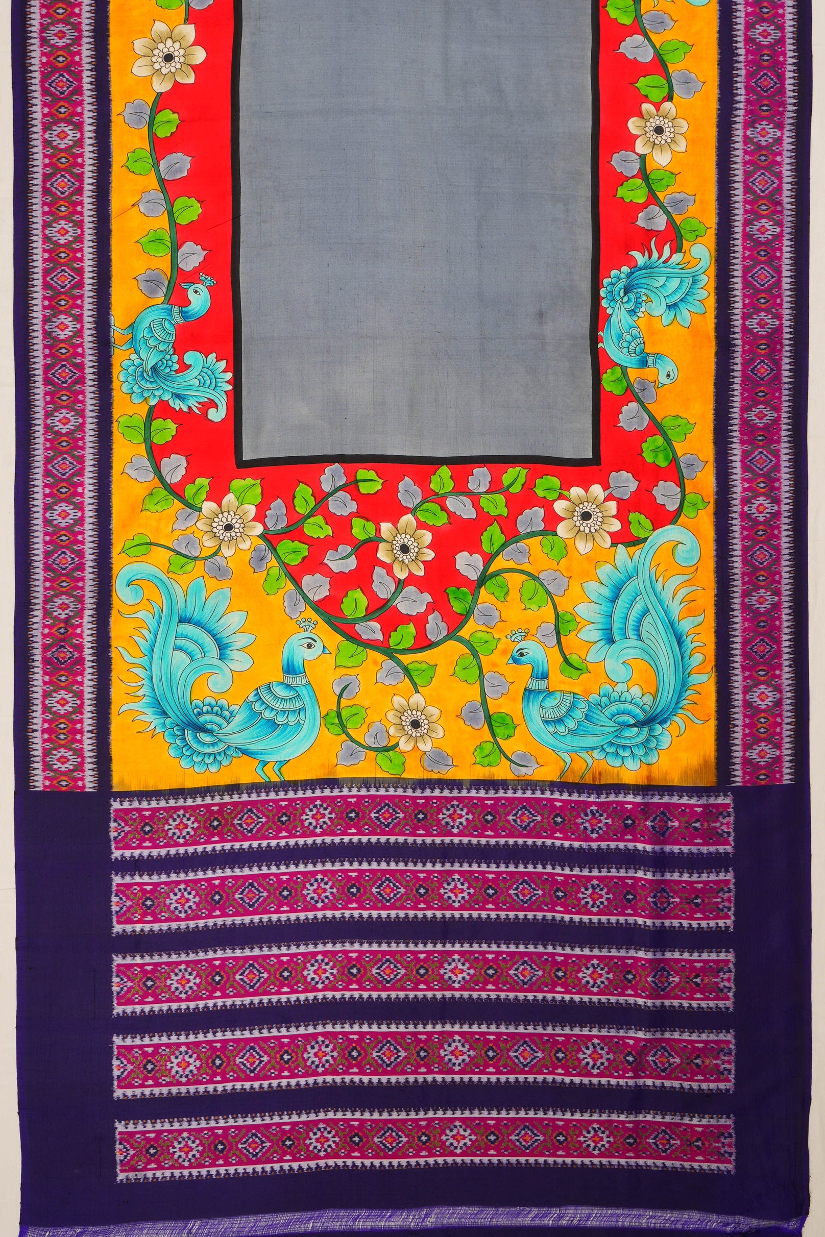 Pochampally Silk Ikat Plain Elephant Grey Saree With Kalamkari
