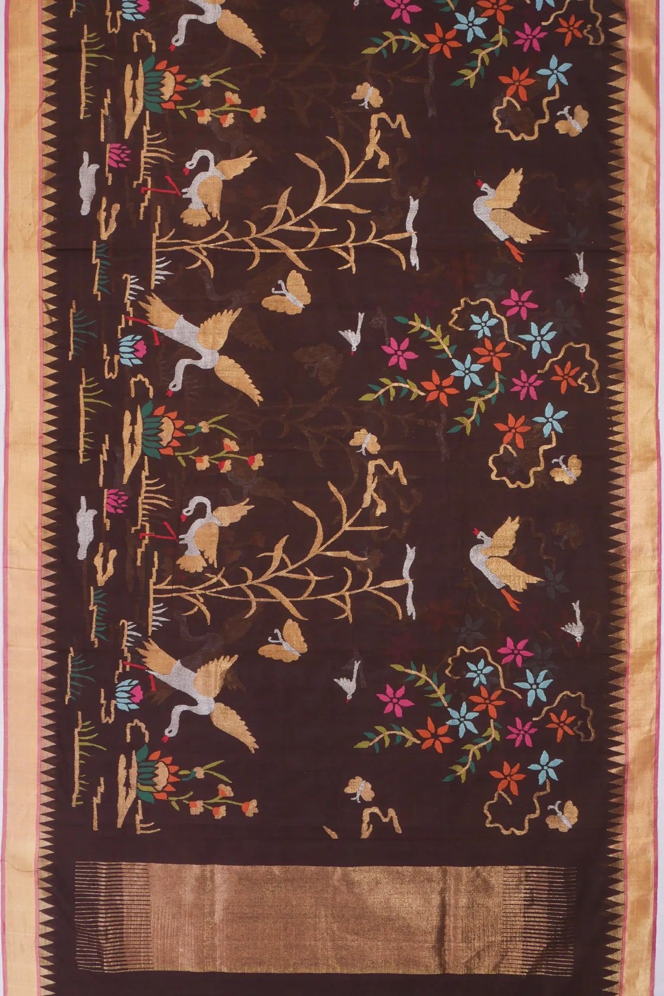 Adorn yourself with the exquisite charm of the Ponduru Handspun Cotton All Over Jamdani Brown Saree, a testament to heritage craftsmanship The saree's body is adorned with floral jamdani patterns and delicate swan motifs, creating an elegant tapestry of tradition and artistry
