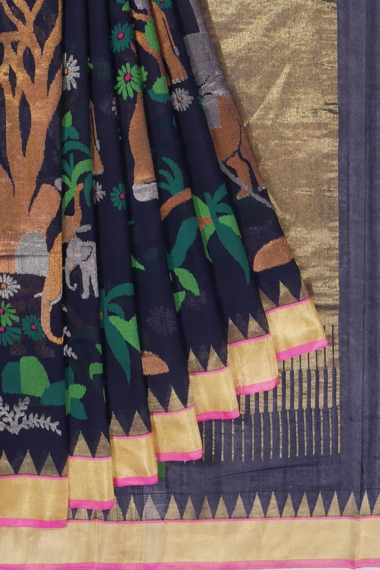Immerse yourself in the rich heritage of Indian craftsmanship with this Ponduru Handspun Cotton Jamdani Saree in a deep, dark blue hue The saree's body is adorned with exquisite all-over floral jamdani patterns, interspersed with enchanting village story lines and animal motifs, creating a tapestry of tradition and art