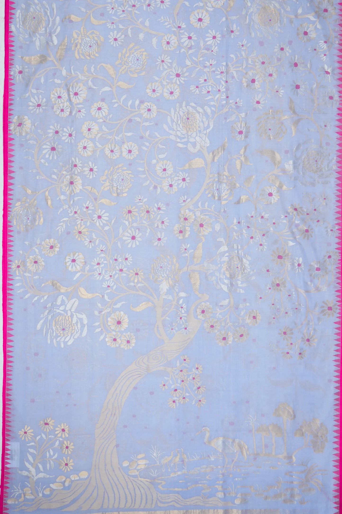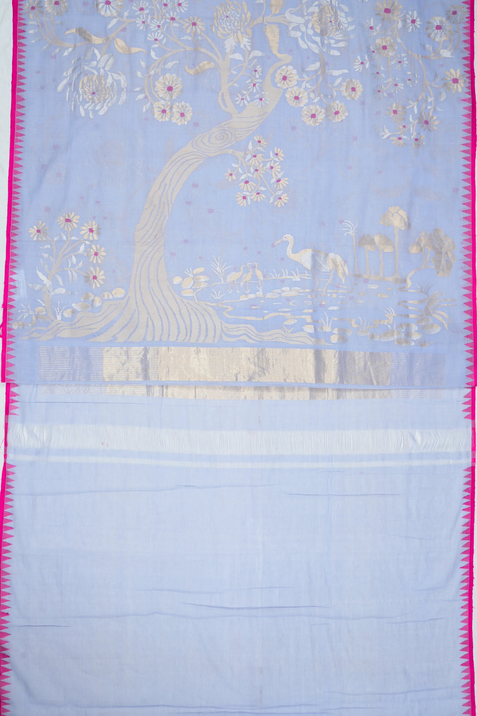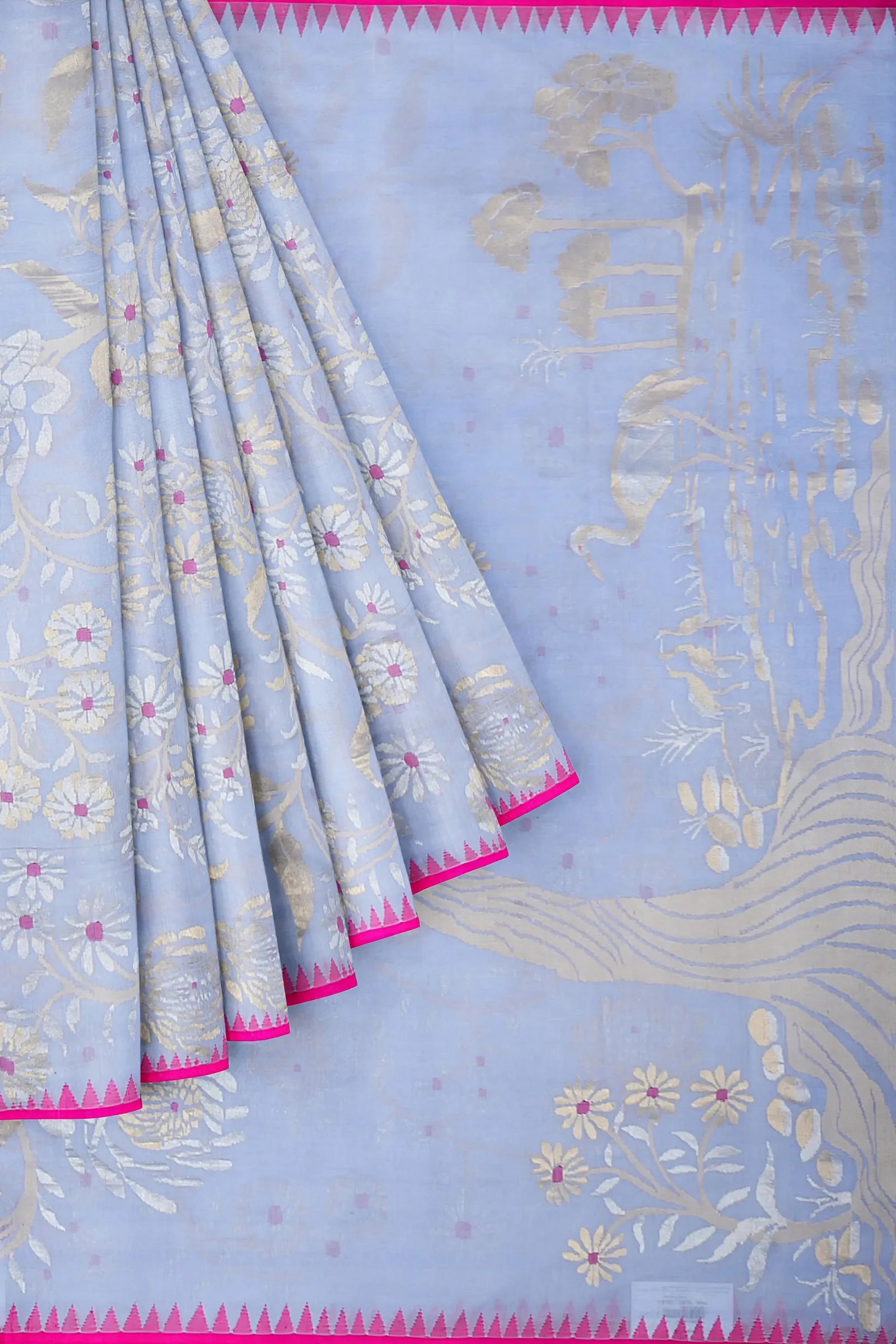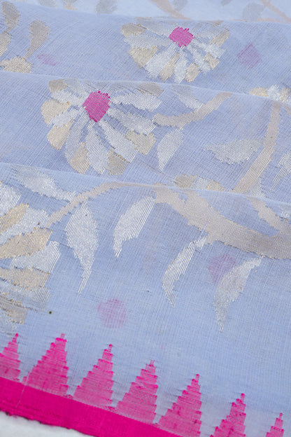 Crafted in soft handspun cotton, the powder blue body is adorned with intricate all-over floral jamdani weaving, offering an ethereal, airy charm.