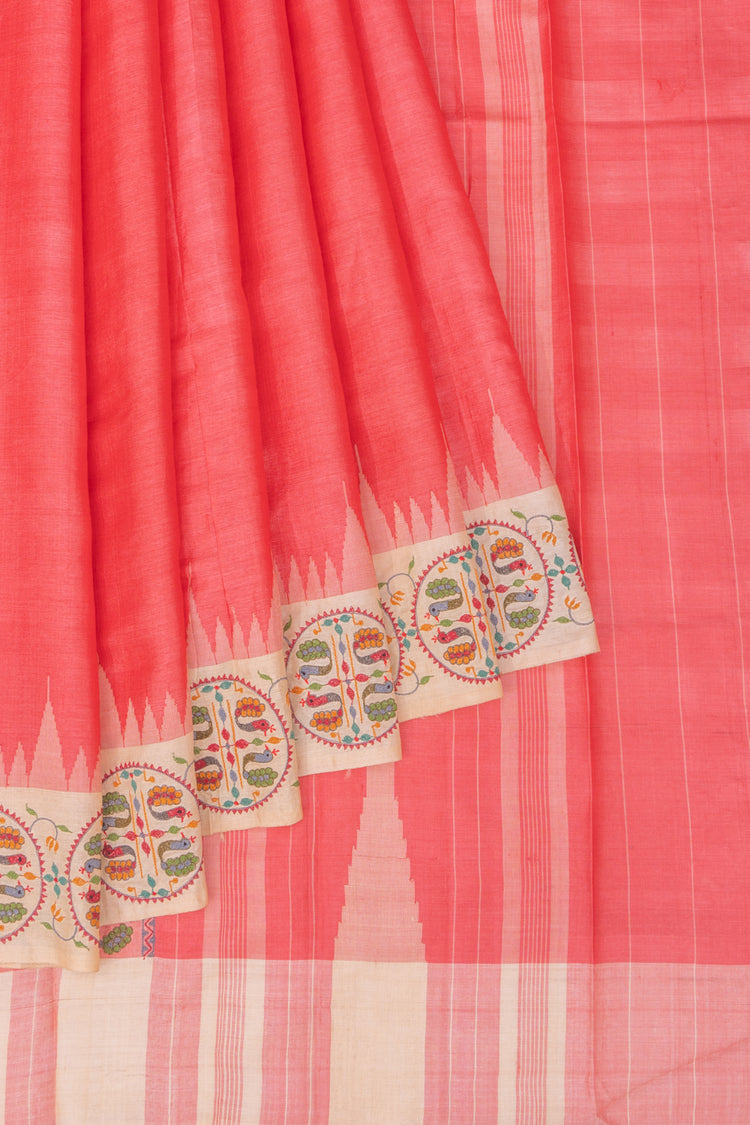 Pure Tussar Plain Peach Saree With Embroidery Border