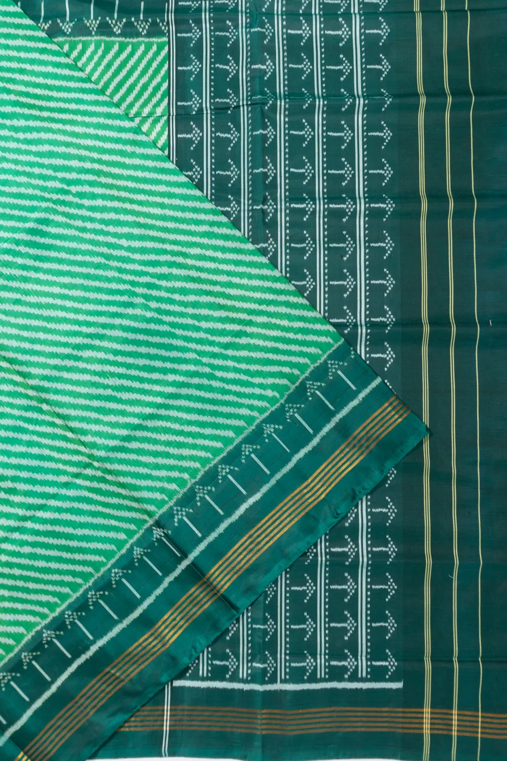 The pallu complements with a matching dark green ikat design, maintaining harmony.