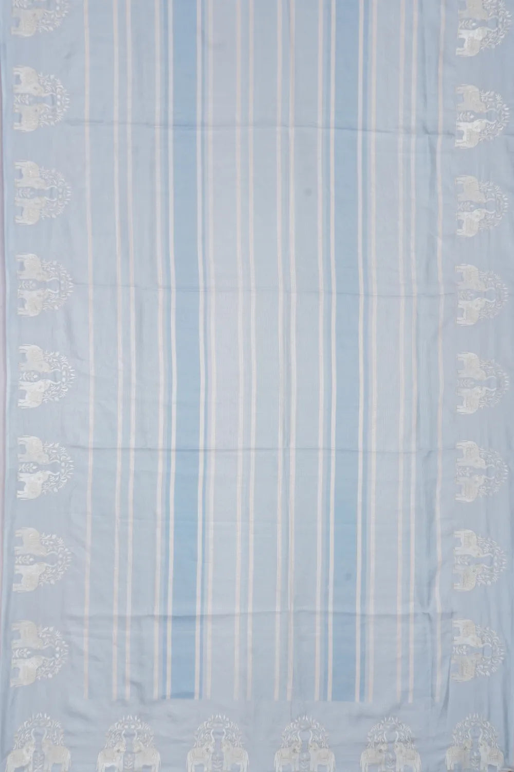 The saree body is adorned with graceful horizontal lines that capture the essence of understated elegance, while the self-embroidery border features charming elephant motifs nestled within delicate floral designs
