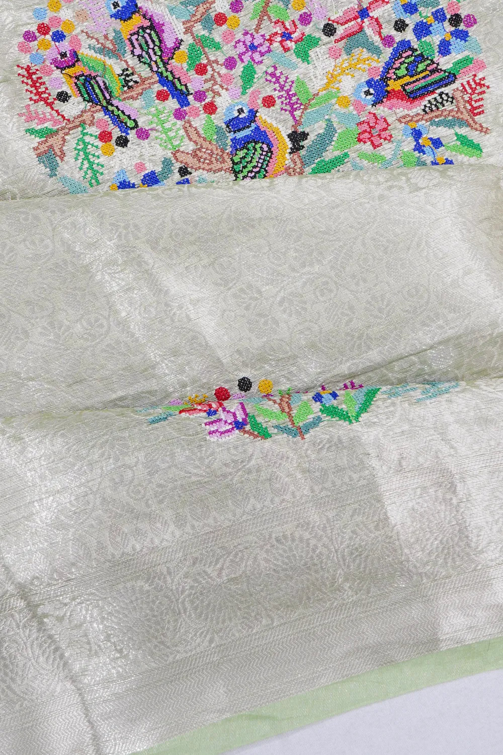 The saree's body is adorned with silver zari floral brocade, enhanced by exquisite embroidery featuring floral, butterfly, and bird motifs that add a touch of whimsical charm