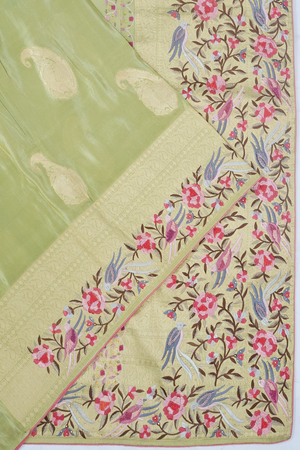 Soft Silk TIssue Butta Pista Green Saree With Embroidery Border