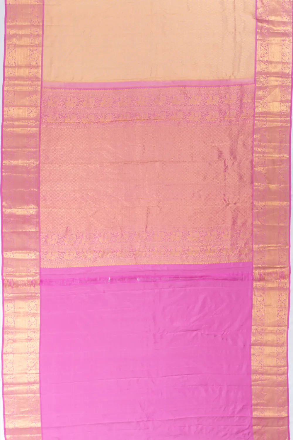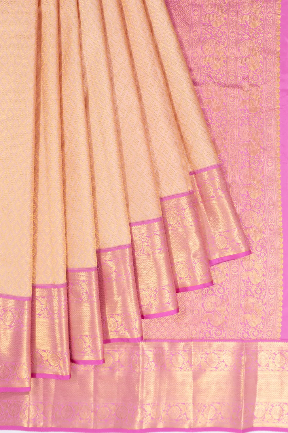 Contrast gold zari zig-zag lines medium pink border with bird motifs in floral brocade, offering a graceful and delicate finish.
