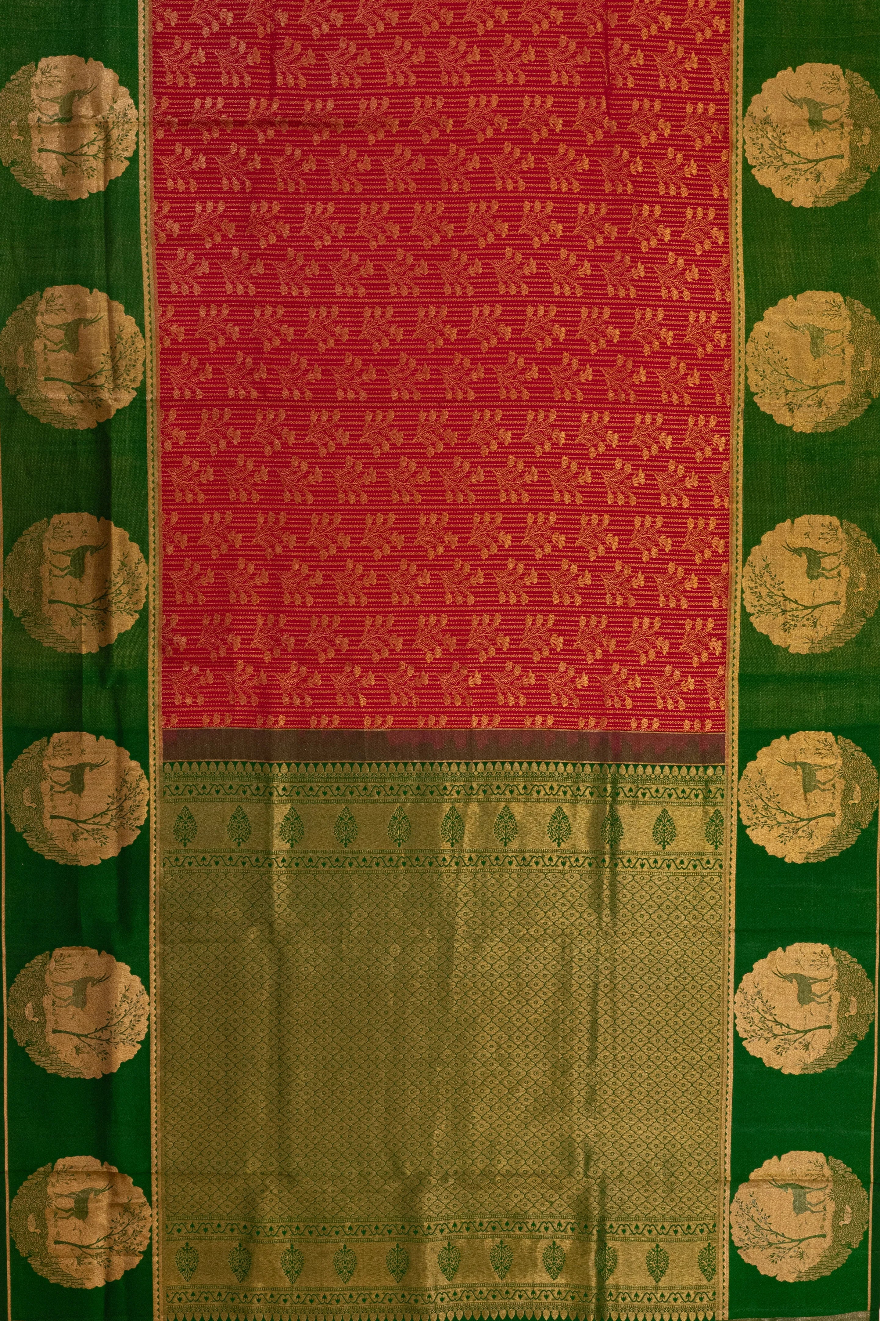 The saree features a contrast green border, intricately detailed with gold zari deer and floral motifs, adding a touch of nature's grace to your ensemble