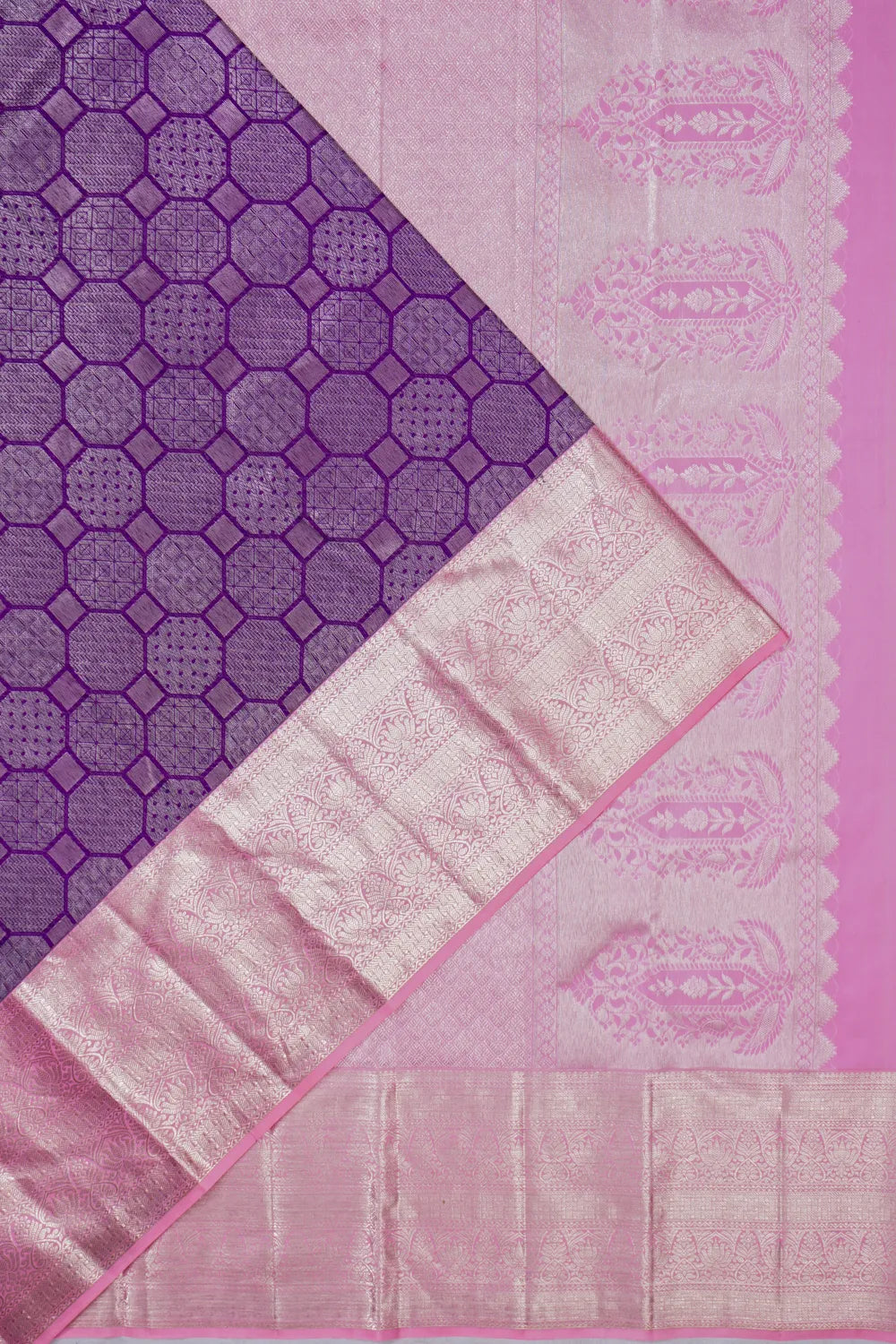 The saree includes a complementary blouse in purple, featuring delicate gold zari detailing that enhances its sophisticated appeal