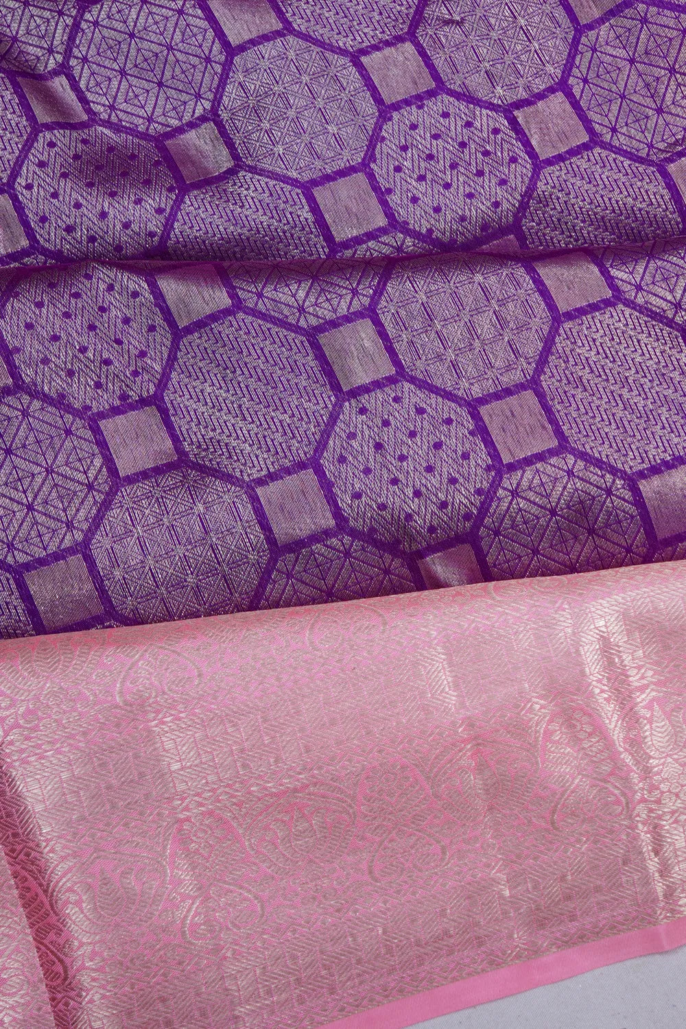 Its rich purple silk canvas is adorned with gleaming gold zari brocade, creating a symphony of heritage-inspired motifs that dance elegantly across the fabric