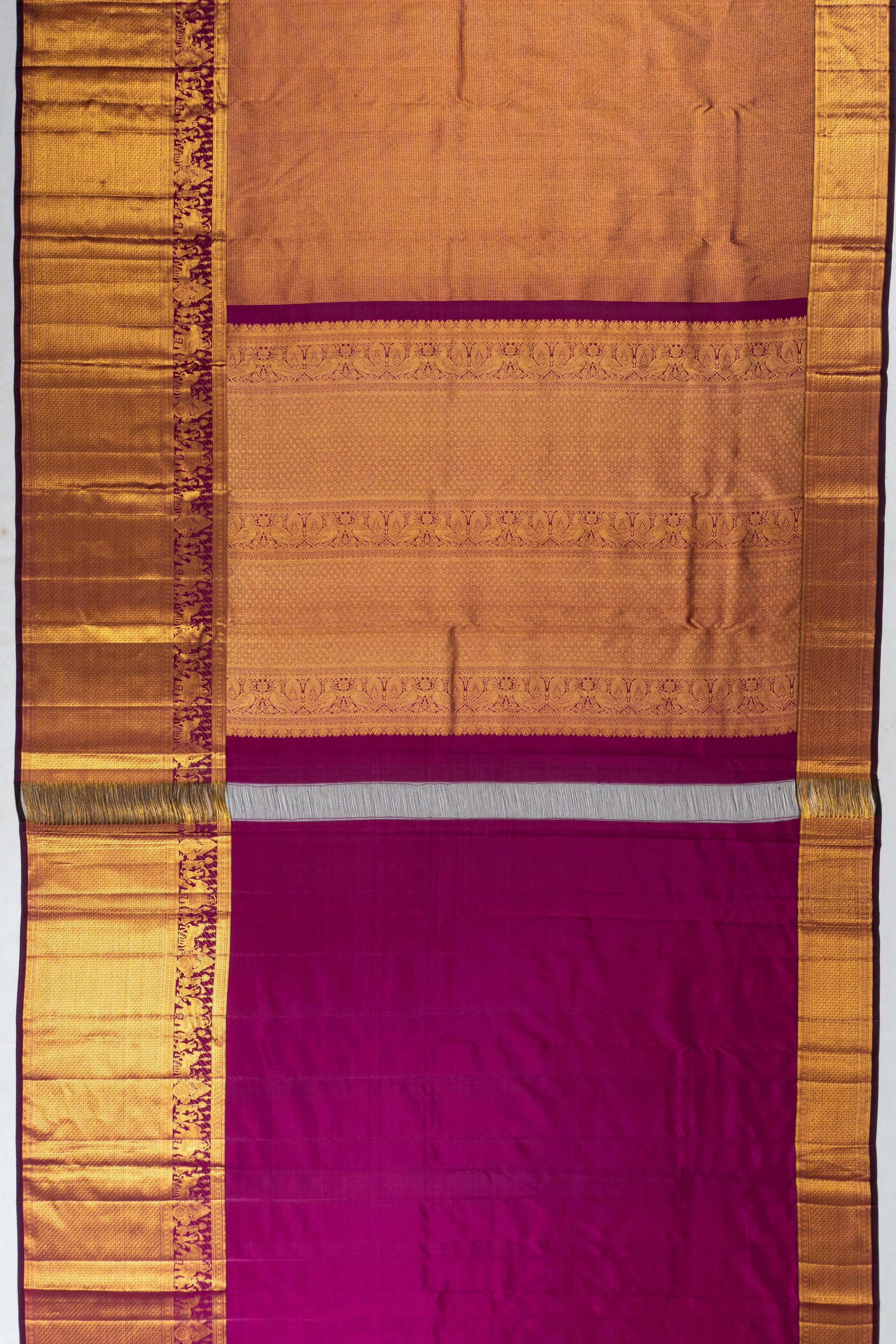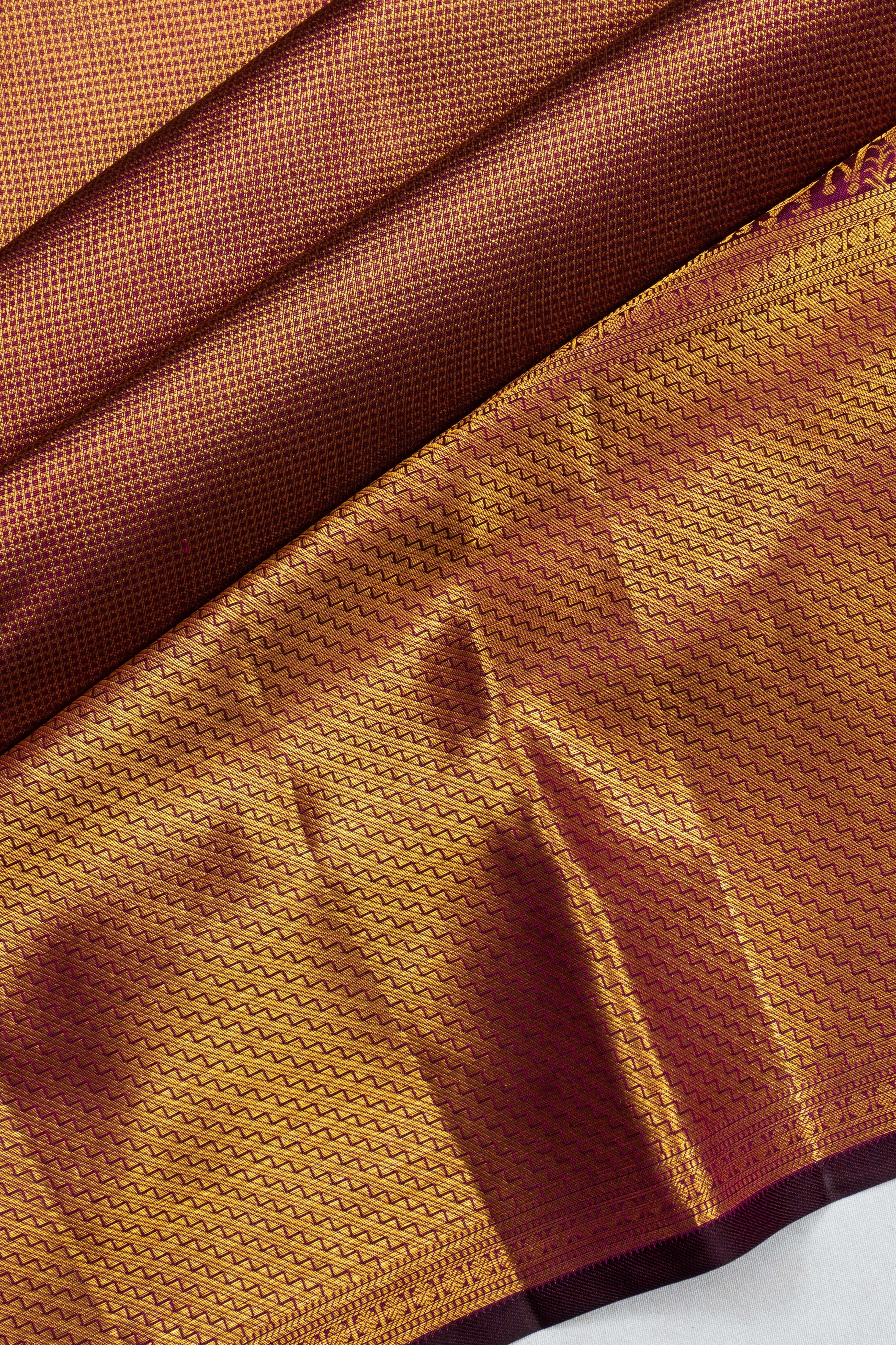The saree's medium border, adorned with self-gold zari diagonal and zigzag lines, is embellished with radham motifs, enriching its classic appeal