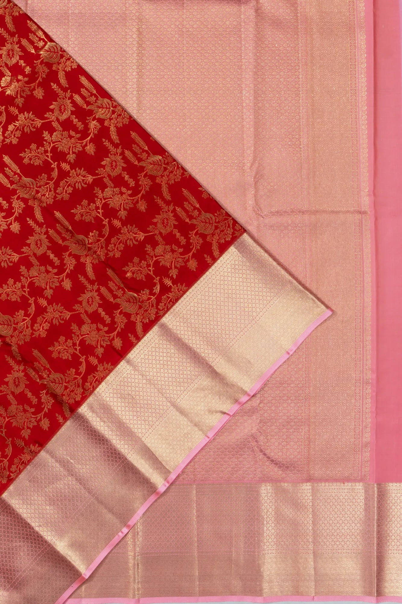 A contrast baby pink medium border in gold zari brocade adds a soft, feminine contrast, bringing freshness and balance to the bold red body.