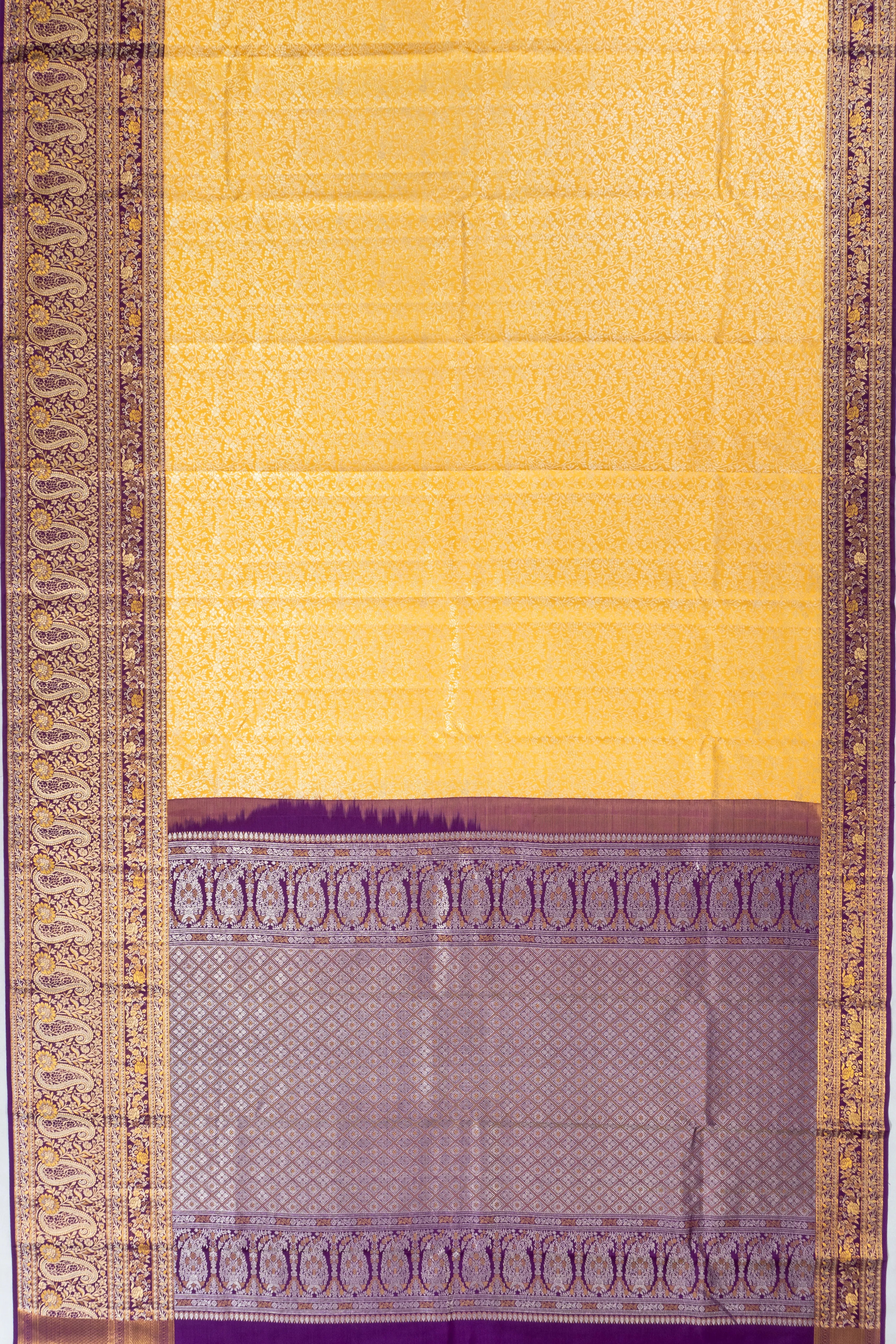 The vibrant yellow silk offers a stunning backdrop, resonating with the rich traditions of Kanchipuram