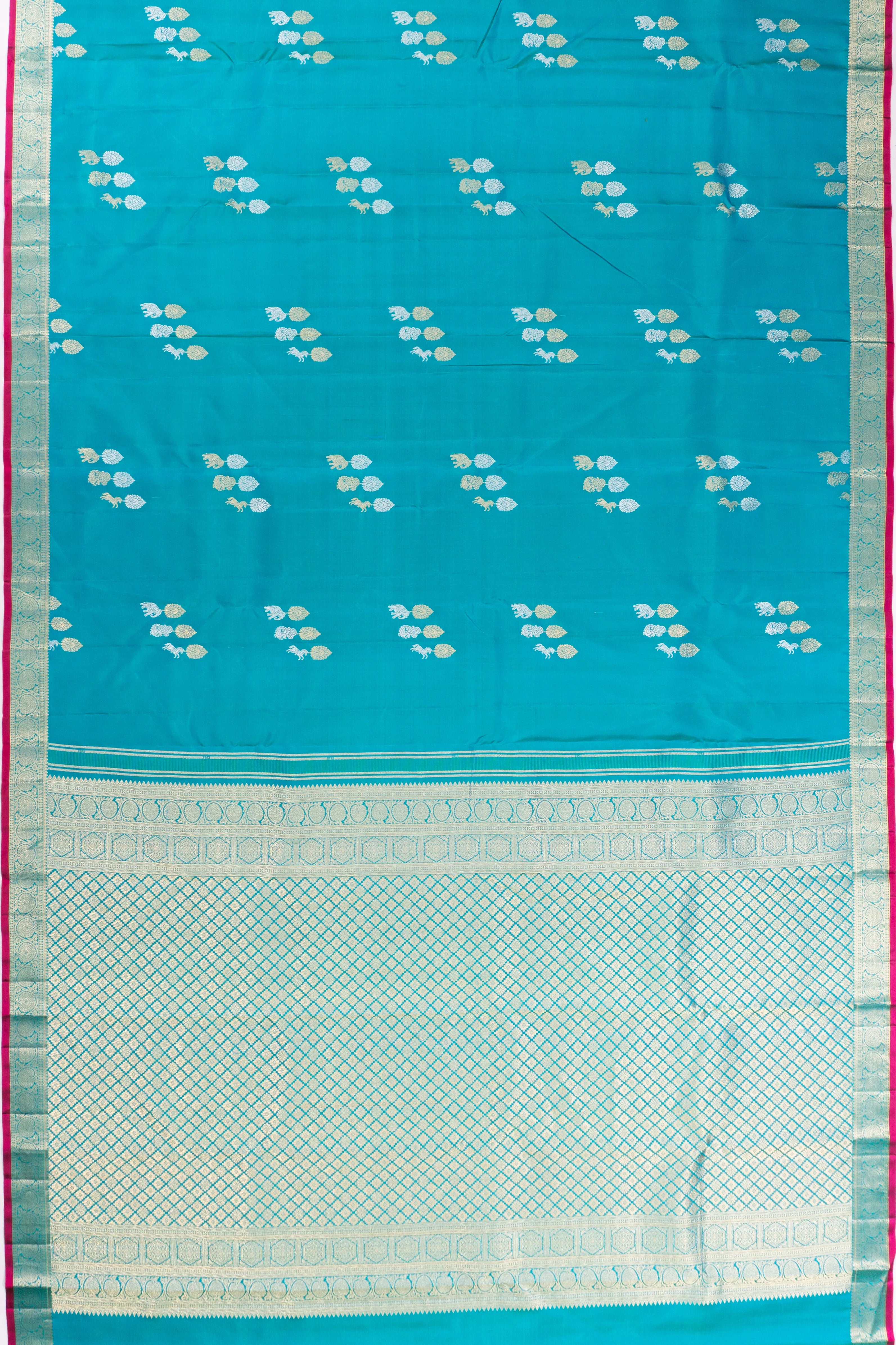 The body of the saree showcases exquisite gold and silver zari elephant, flower, and horse motifs, each weaving a tale of heritage onto the luxurious silk canvas