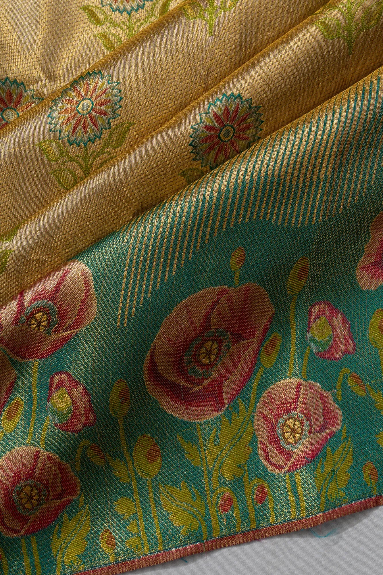The luxurious gold zari tissue body, adorned with delicate floral buttas, exudes a graceful charm that captivates the senses