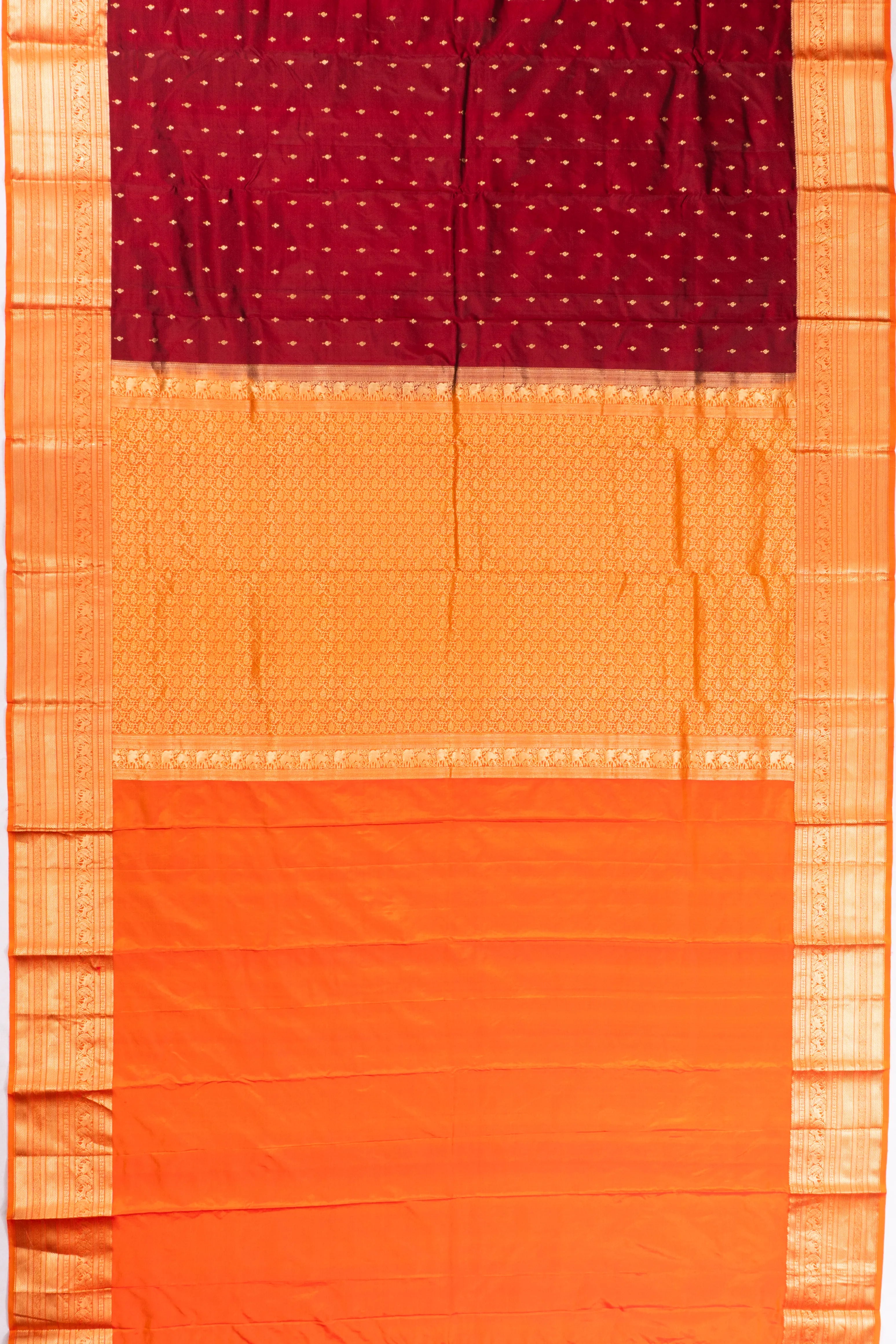 The saree features a striking contrast border in orange, beautifully detailed with gold zari floral vines, as well as elephant and horse butta brocade