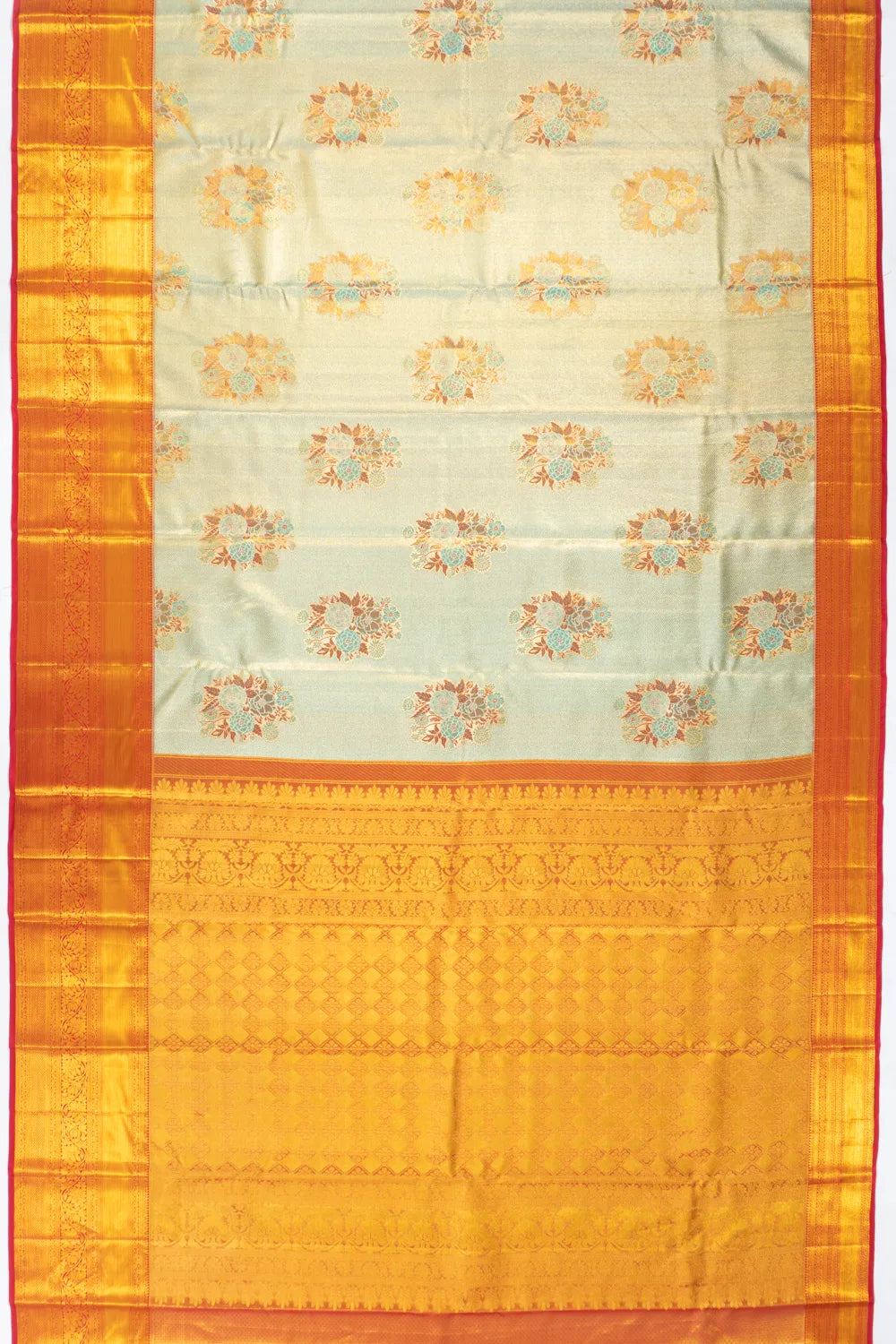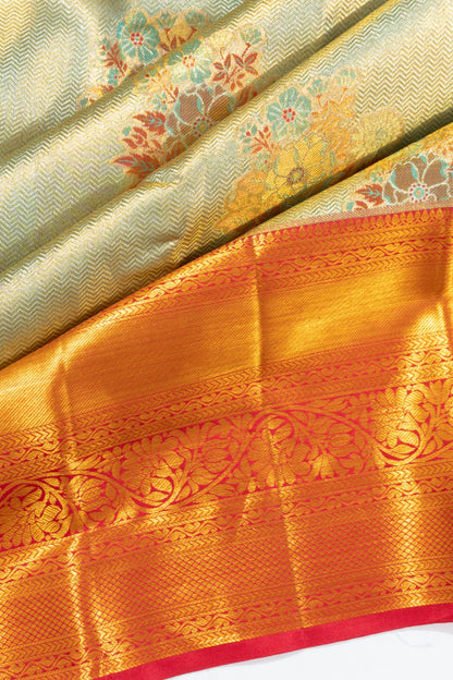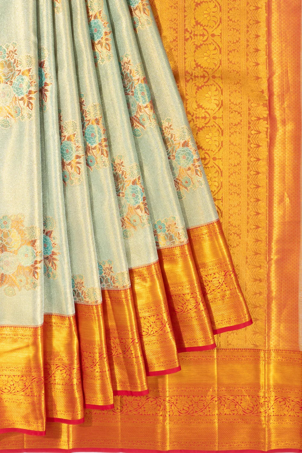 Ethereal blue tissue silk enhanced with gold zari zig-zag lines and delicate floral buttas, exuding a subtle shimmer and charm.
