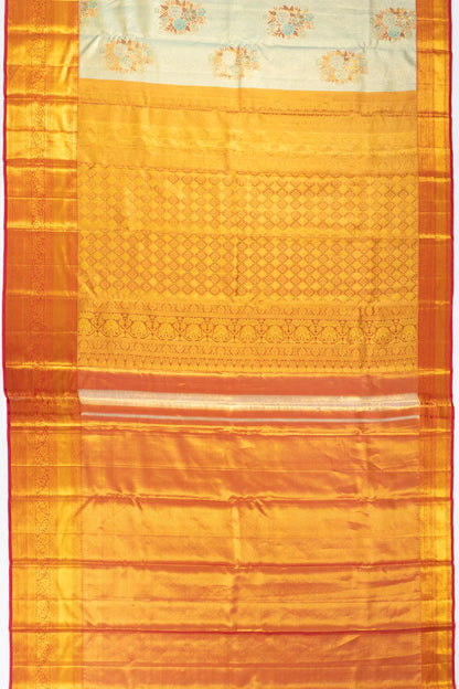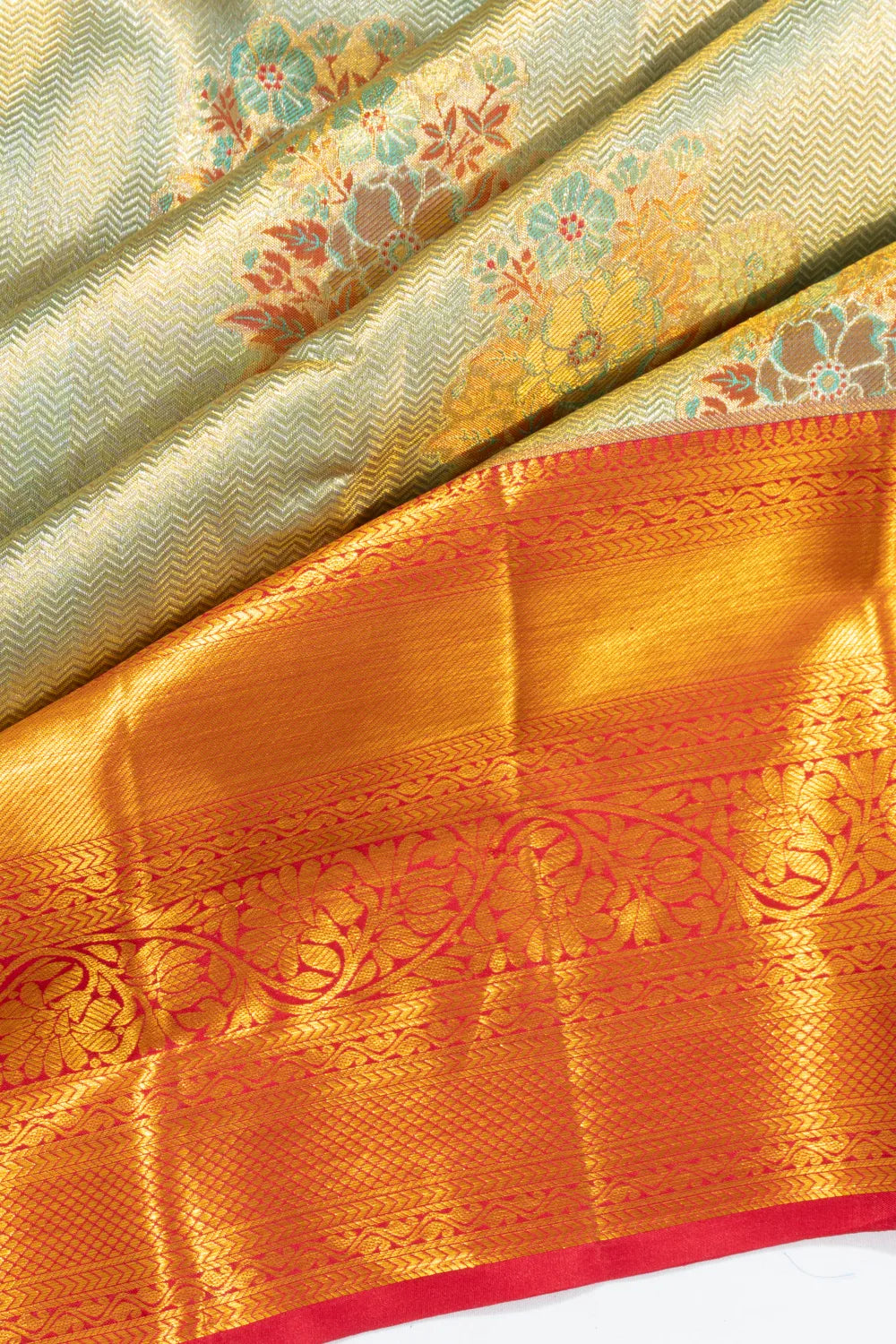 A lavish contrast floral brocade pallu woven in gold zari, offering a rich visual appeal.