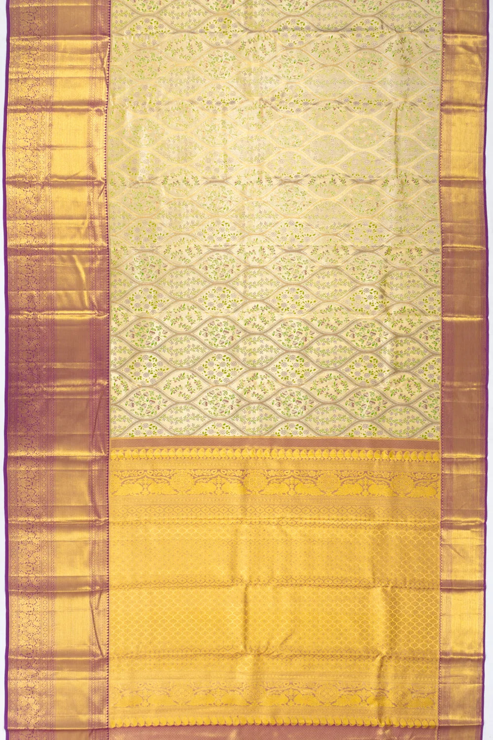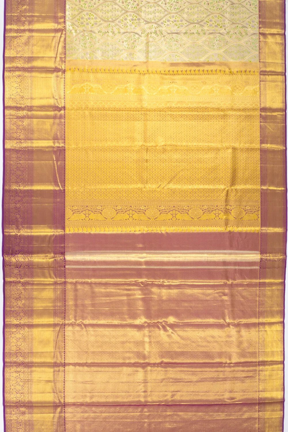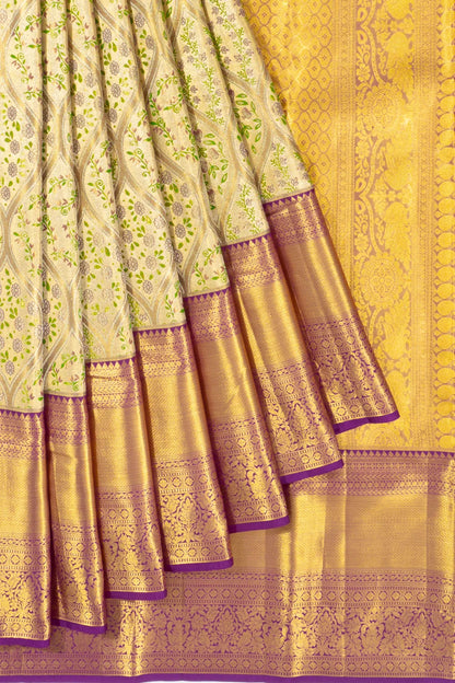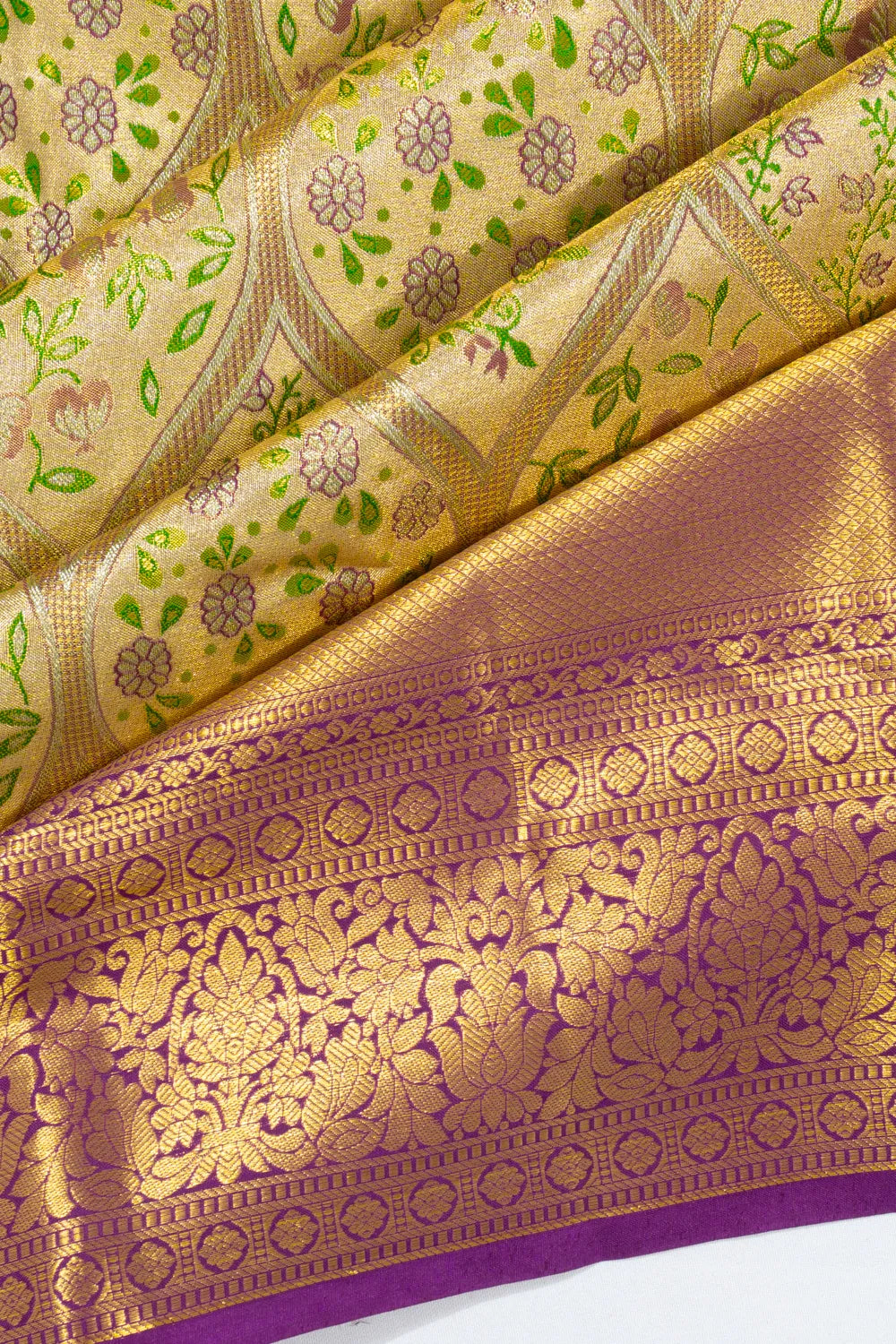 Striking contrast violet big border in gold zari brocade, embellished with flowing floral vines for added grandeur.