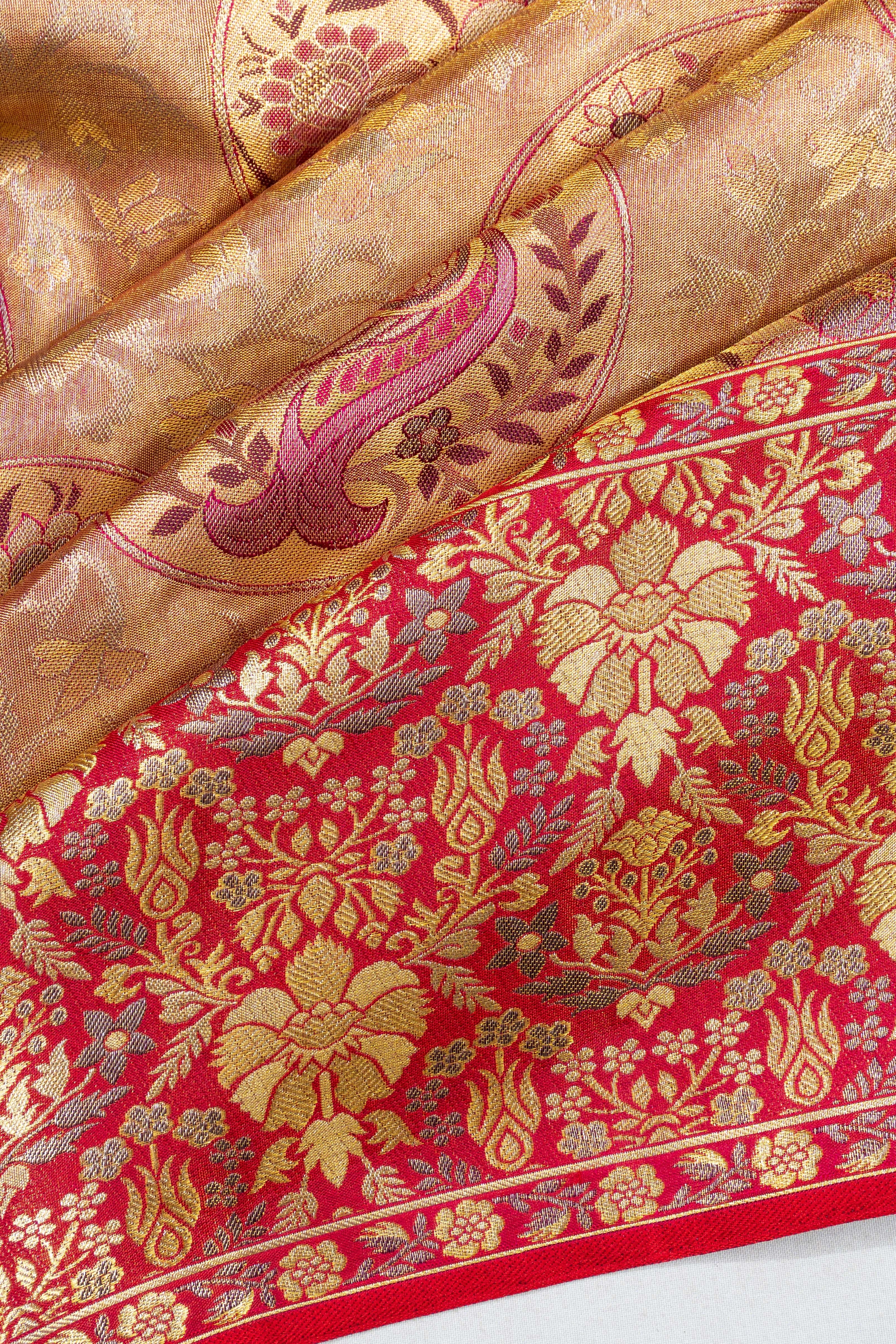Paired with a coordinated red blouse, featuring gold zari tissue and floral brocade with elegant zari borders, this ensemble is a testament to timeless elegance