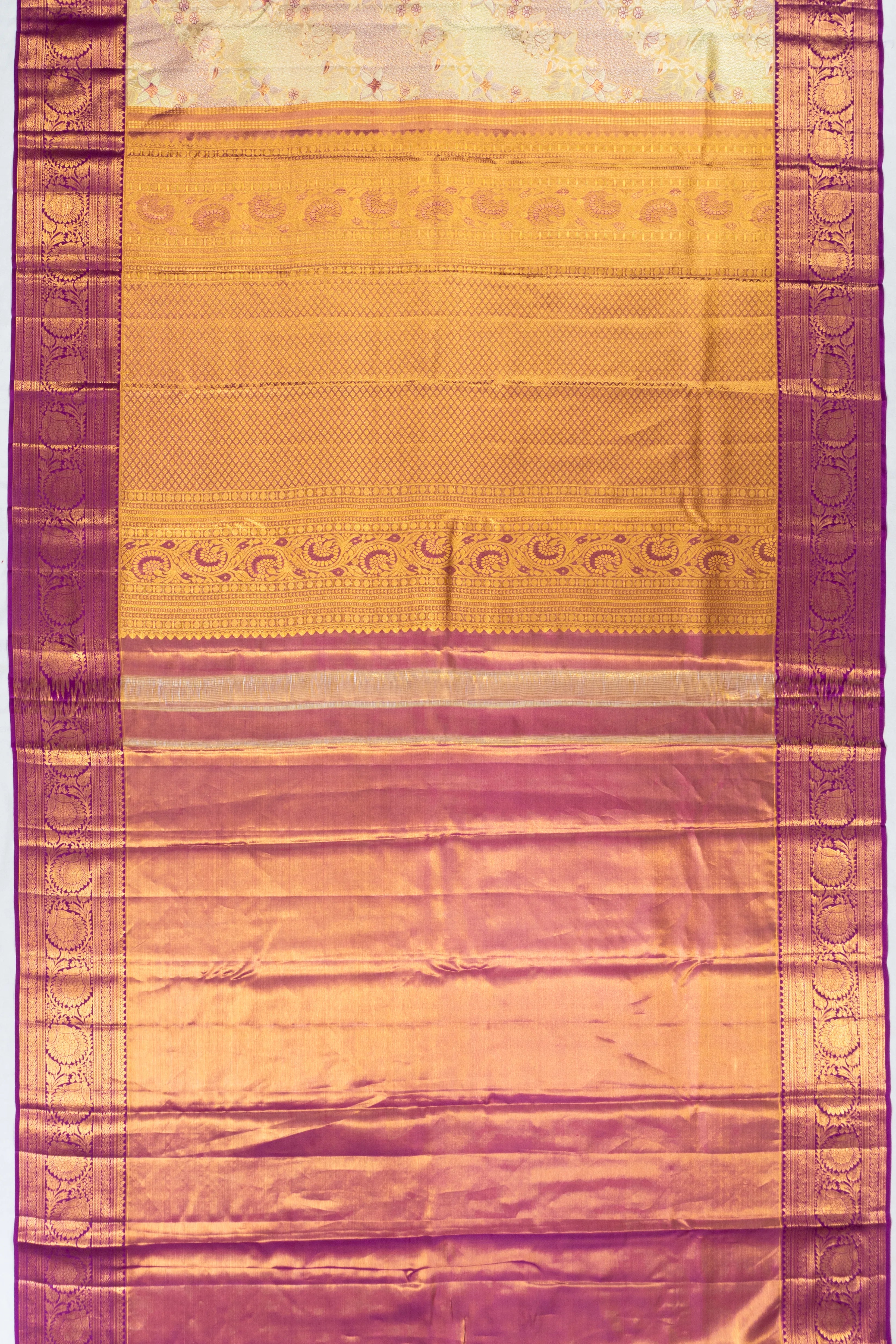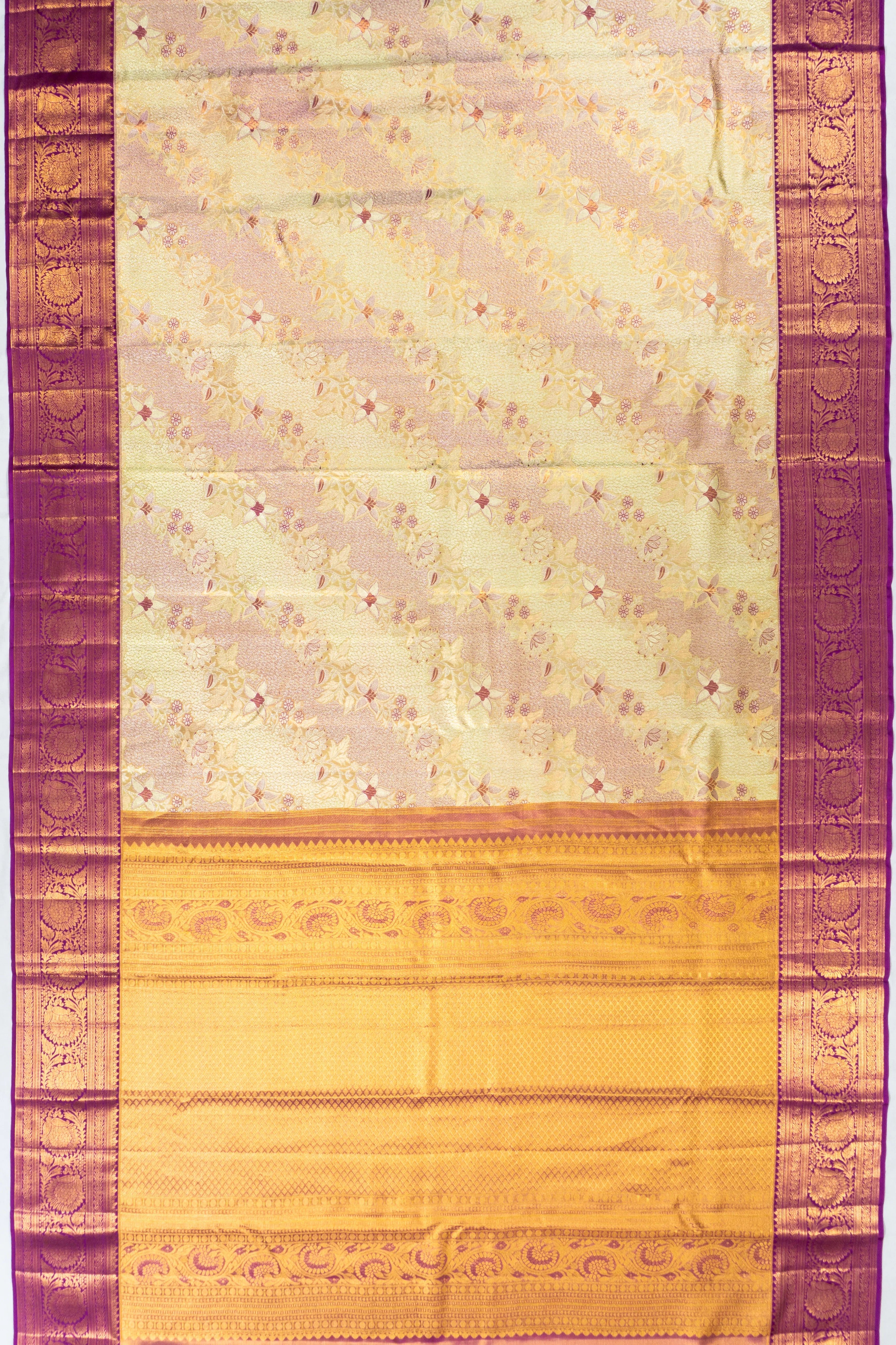 Embrace the splendor of tradition with the Taranga Kanchi Silk Tissue Brocade Gold Saree, a masterpiece of elegance and heritage The saree's body is adorned with exquisite gold zari tissue, embellished with silver zari floral brocade, exuding a luxurious aura