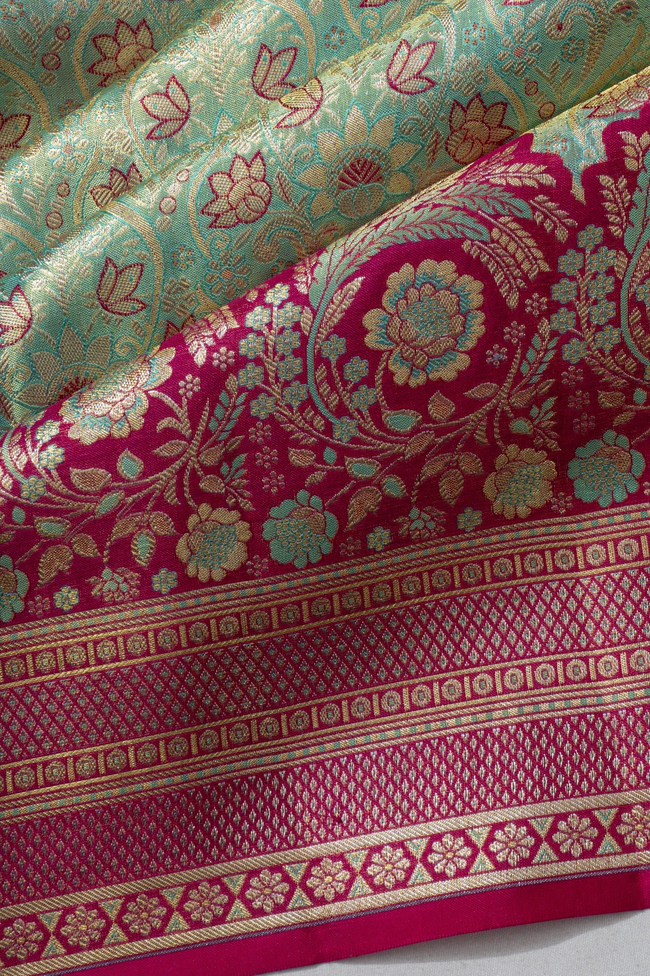 Adorn yourself with the regal allure of the Taranga Kanchi Silk Tissue Brocade Green Saree, where tradition meets timeless elegance The saree's body is crafted from luxurious silk, woven with a gold zari tissue and accentuated by silver zari floral brocade, creating a mesmerizing interplay of shimmer and floral artistry