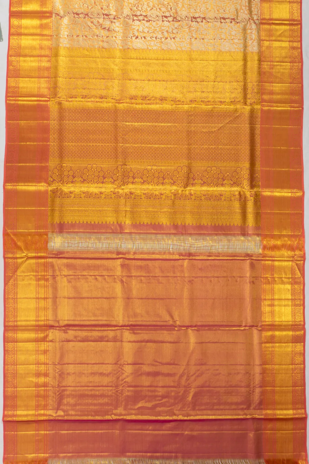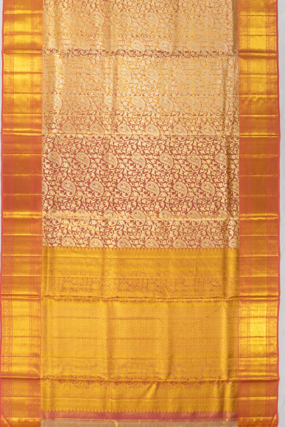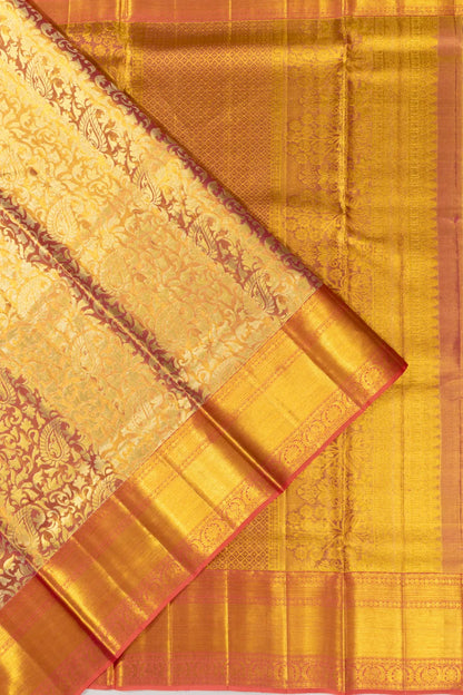 The self gold zari brocade pallu carries through the floral vine motifs, adding to its timeless charm.