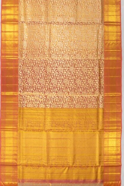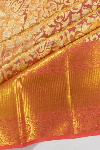 A graceful pink tissue base enriched with gold zari floral brocade, radiating a soft sheen with intricate craftsmanship.