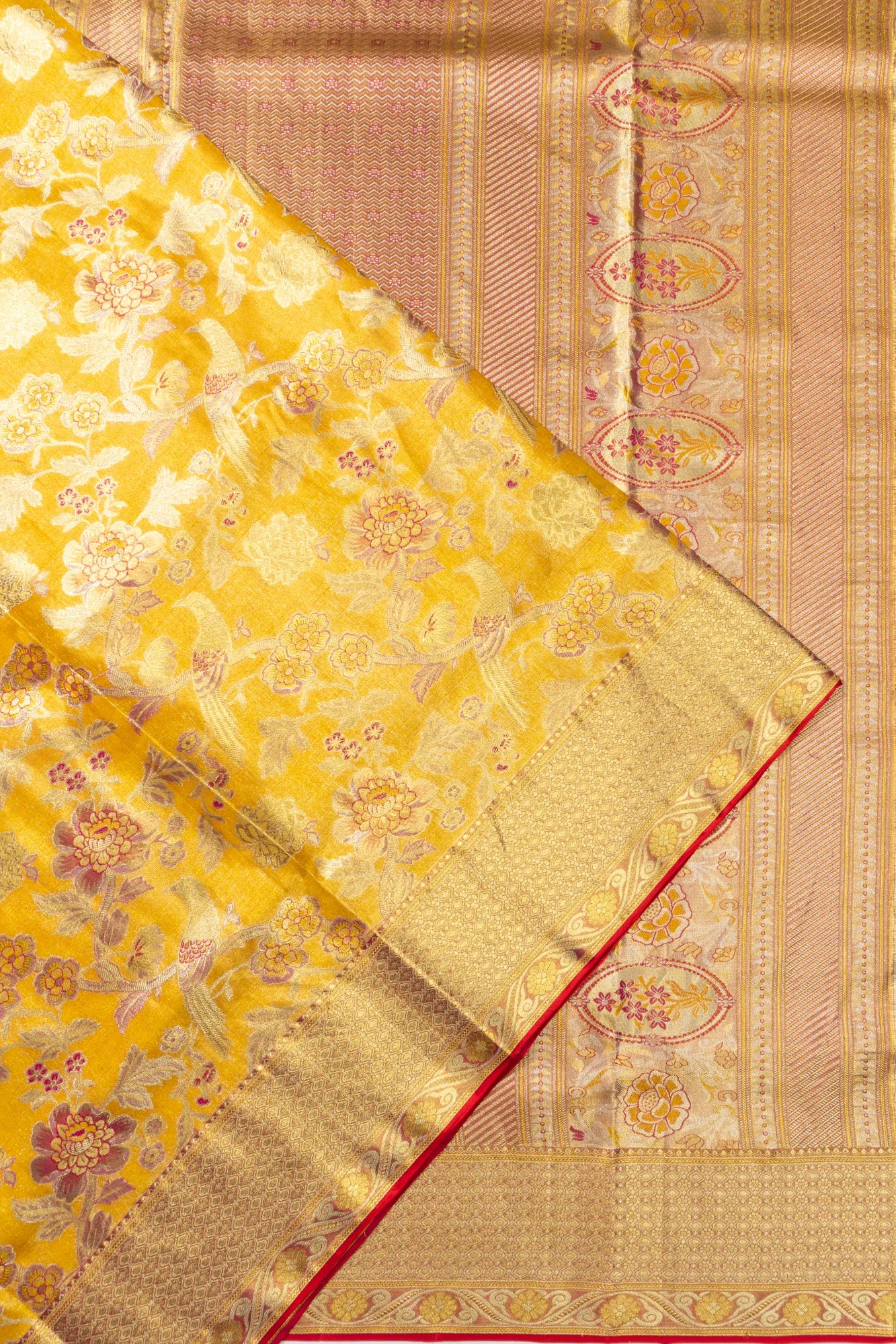 Immerse yourself in traditional beauty with this Taranga Kanchi Silk Tissue Brocade Yellow Saree, a testament to heritage-rich craftsmanship The body is intricately woven in gold zari tissue, adorned with floral brocade and bird motifs that spell an aura of classic elegance