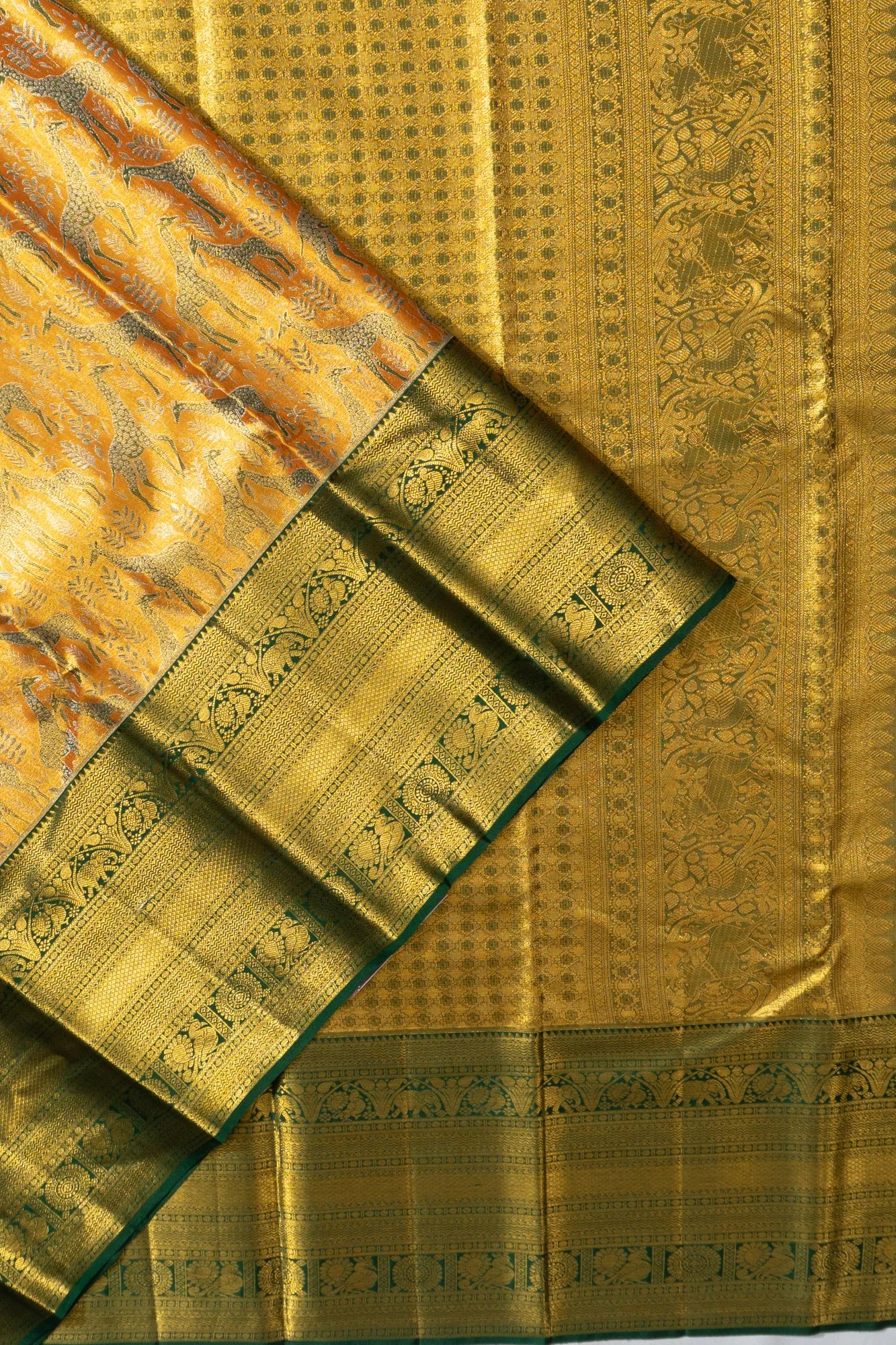 A medium border in vibrant green frames the saree with grace, showcasing a series of gold zari brocade peacocks, elephants, and floral motifs