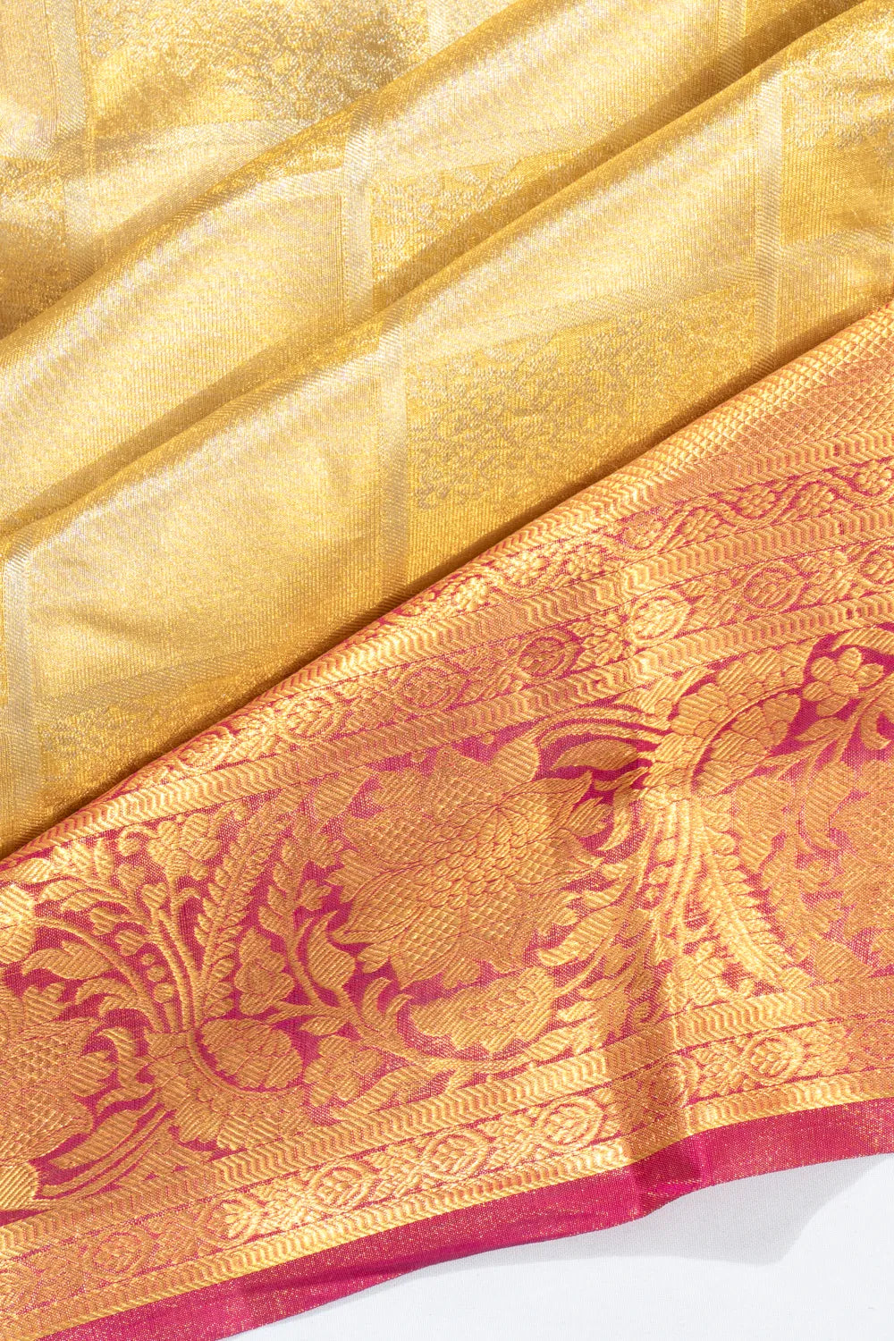 Luxurious gold zari tissue base detailed with intricate checks and floral motifs nestled in between, giving a structured yet ornate look.
