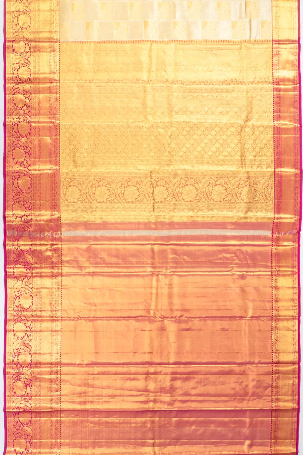 Complementary contrast gold zari brocade pallu with elegant floral vines, seamlessly extending the grandeur.