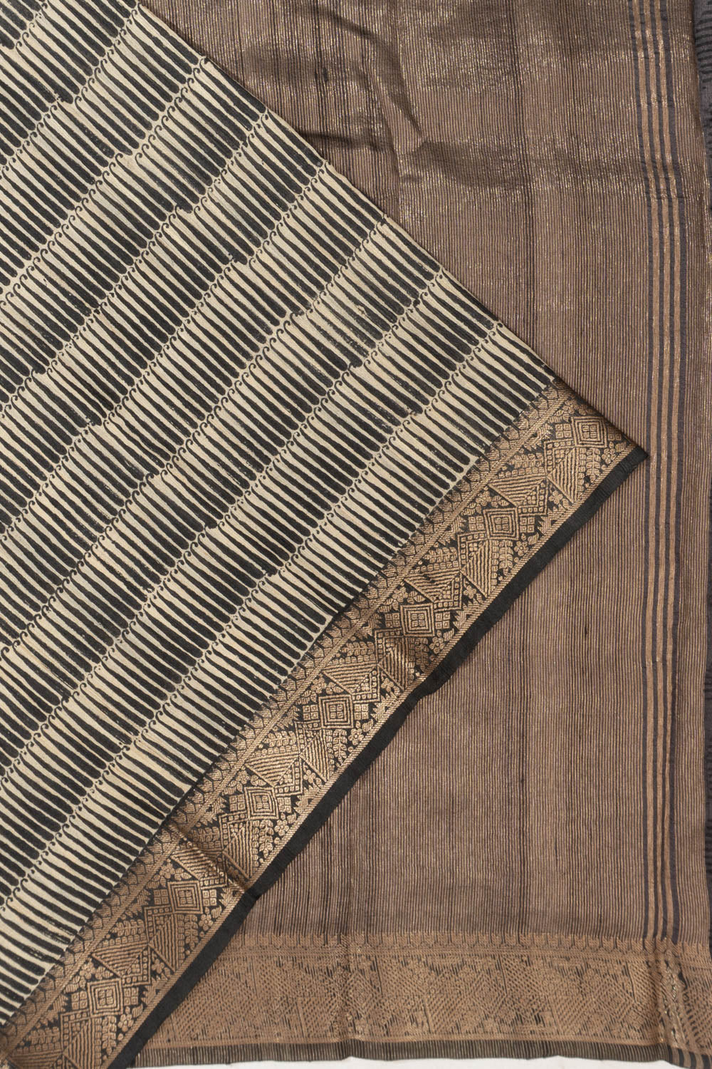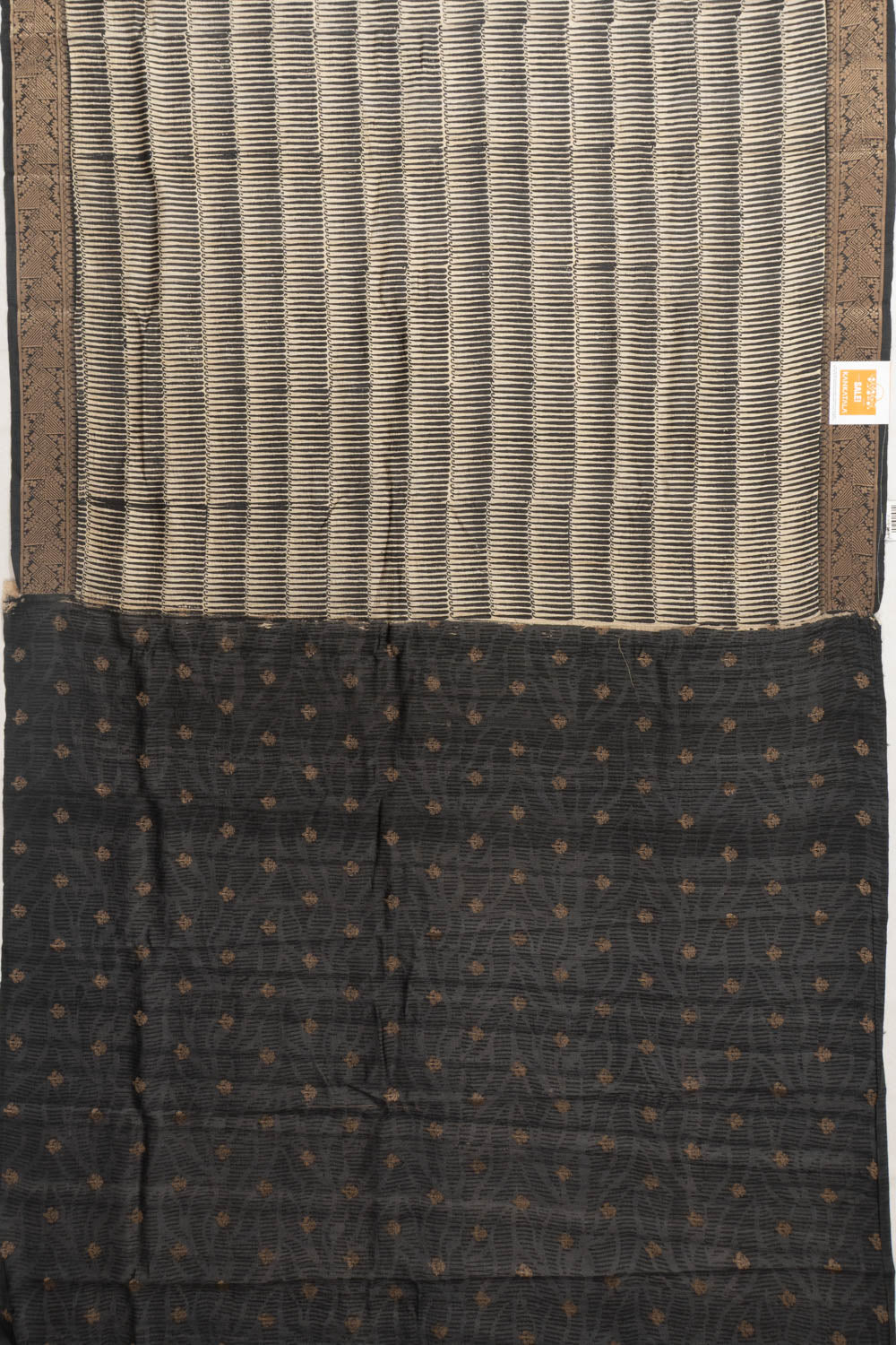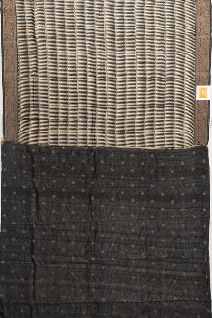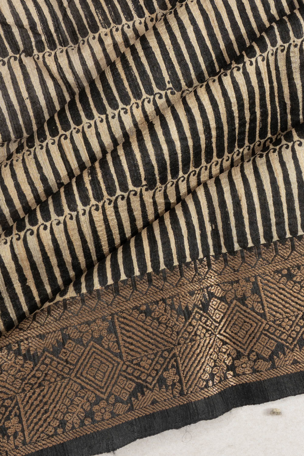 Deep black tussar silk adorned with intricate paisley brocade patterns.