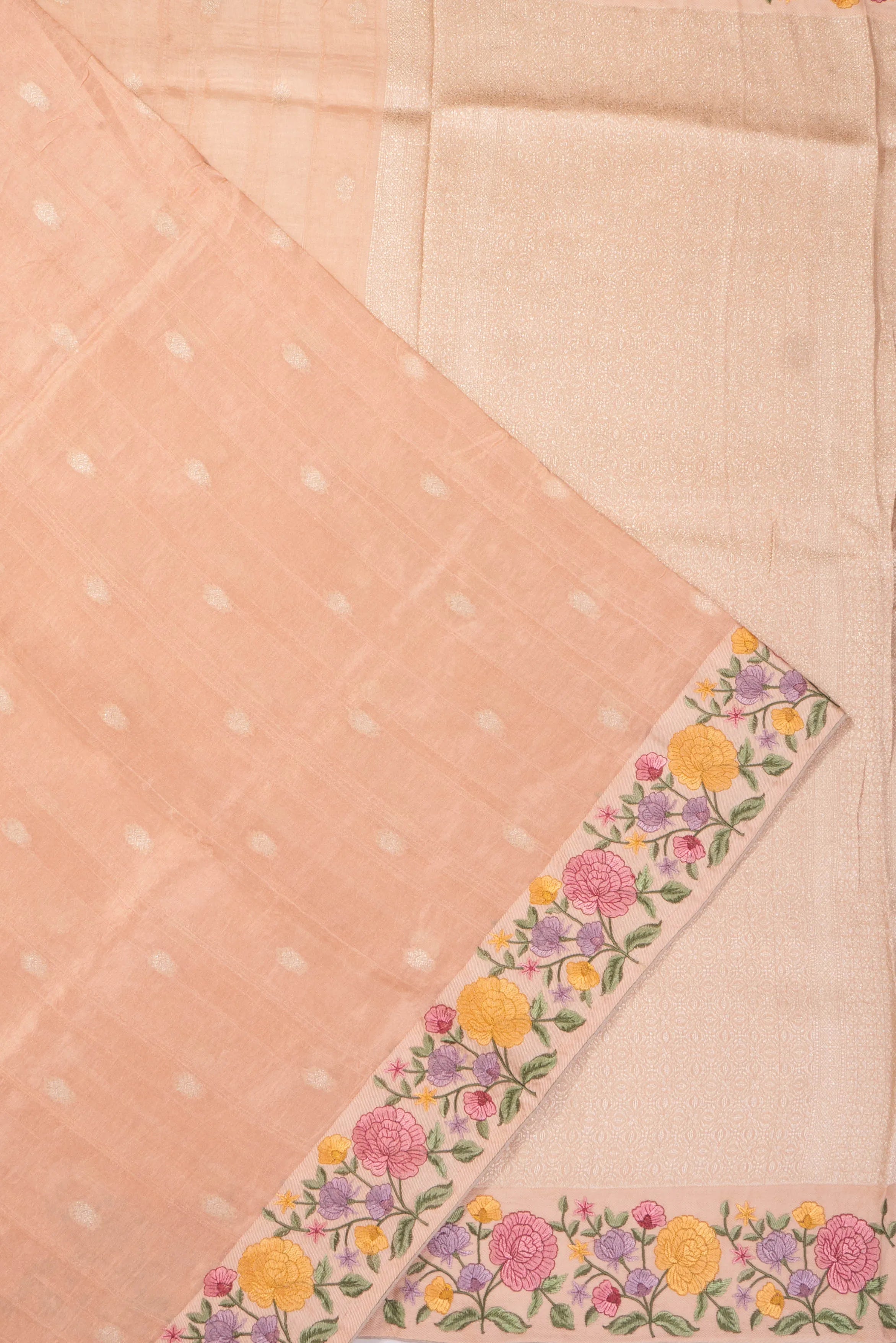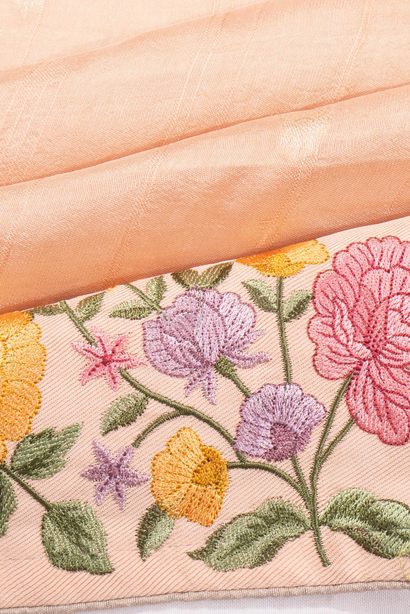 This saree features a self-border embellished with multicolour floral embroidery, lending a vibrant yet sophisticated touch to the ensemble