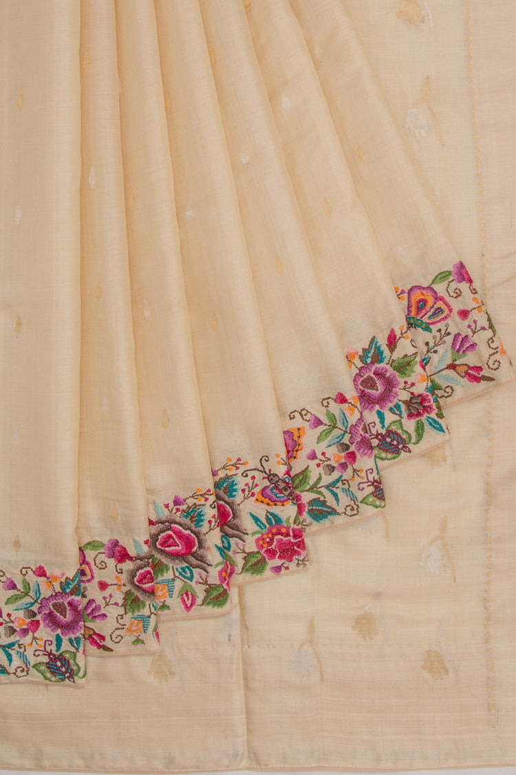 Tussar Butta Beige Saree With Multicolour Floral Embroidery Border