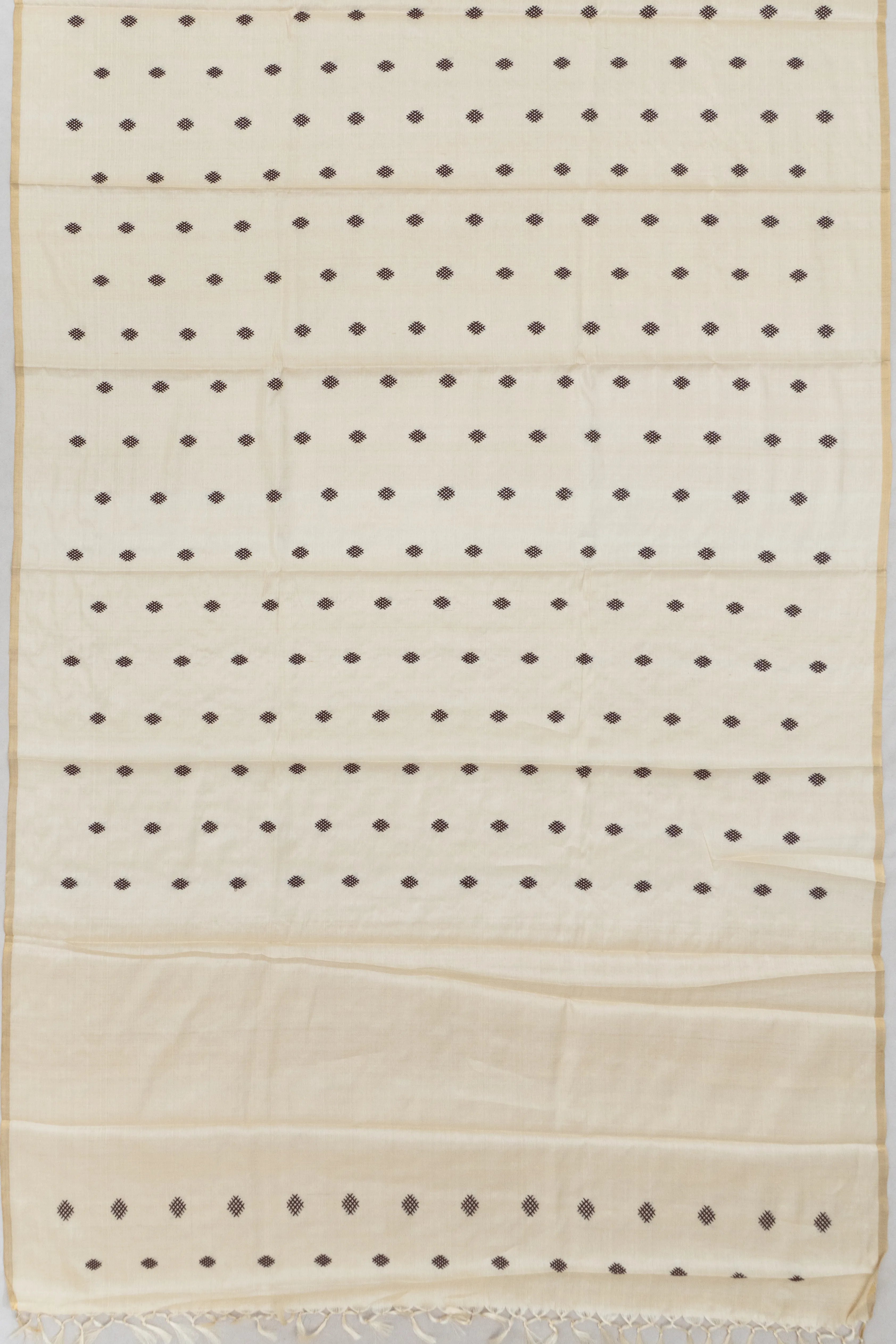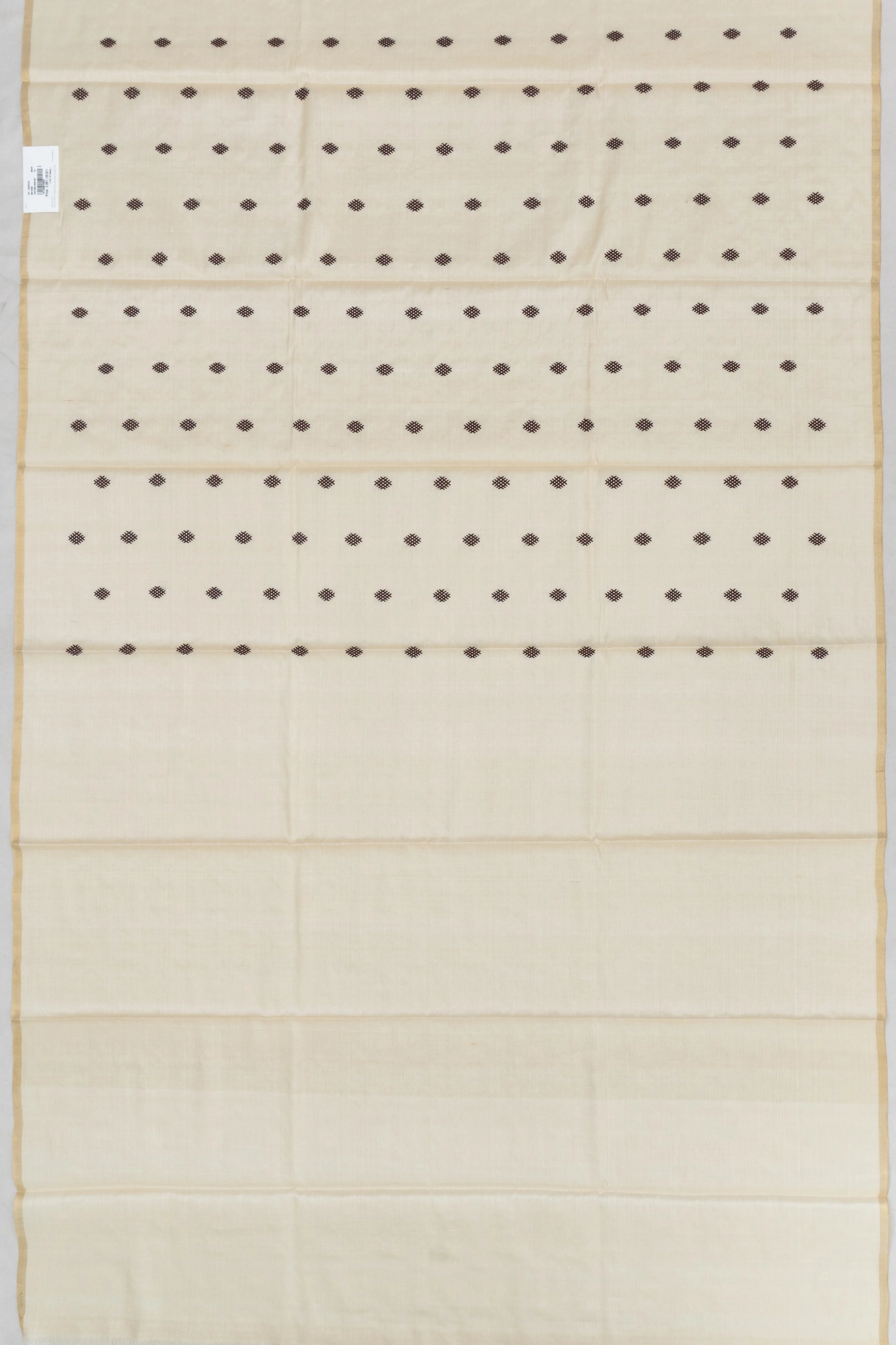 The saree features a subtle yet sophisticated gold zari edge, enhancing its timeless appeal without the need for a traditional border