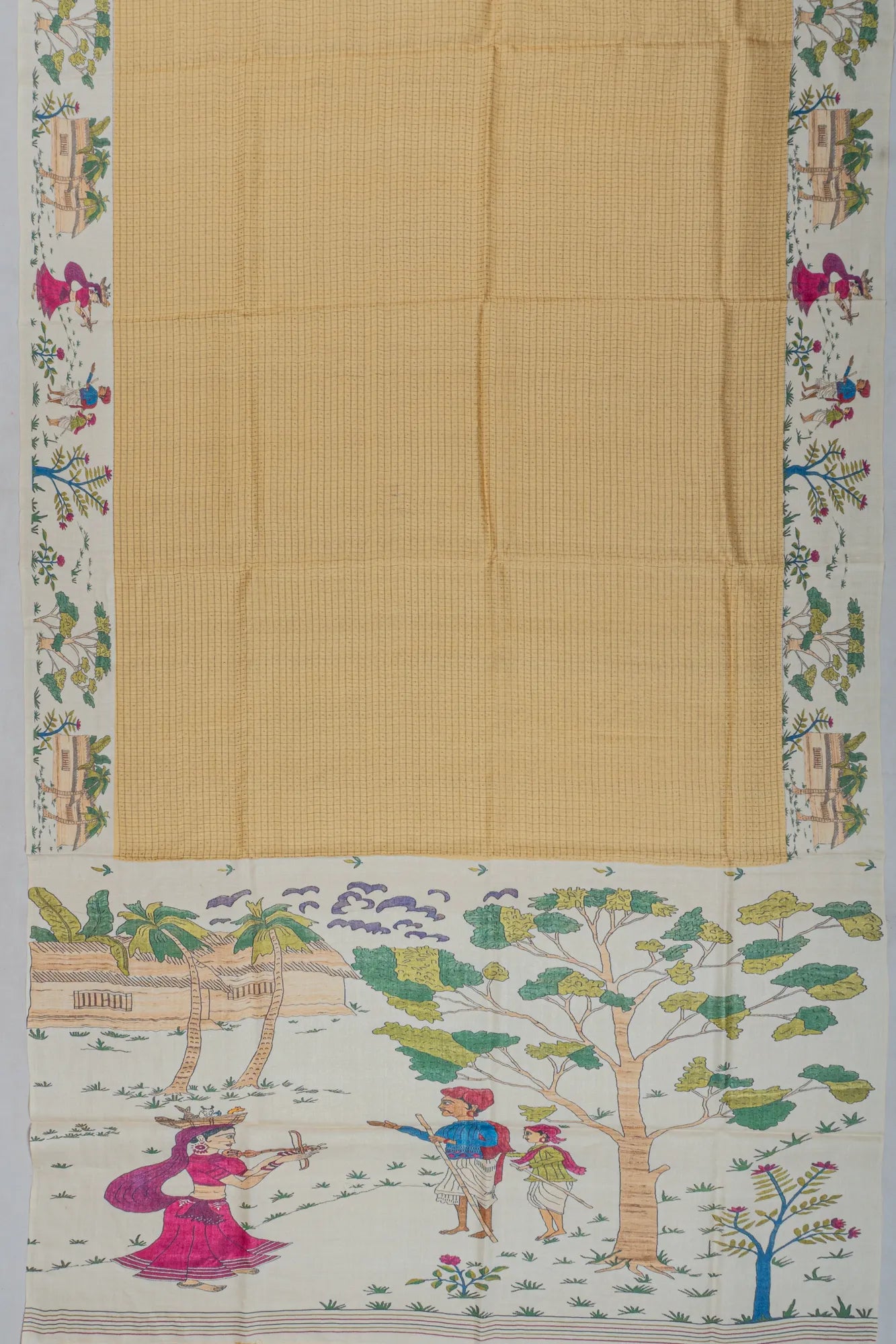 The pallu illustrates a village storyline through rich floral prints, capturing the essence of cultural heritage